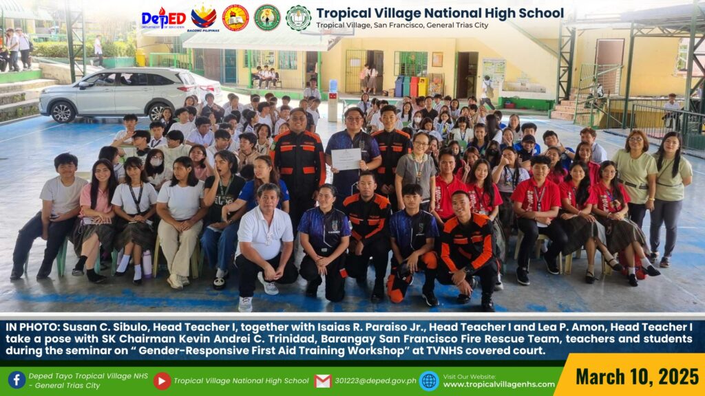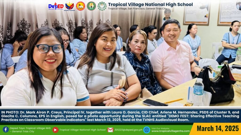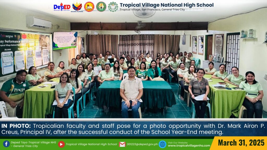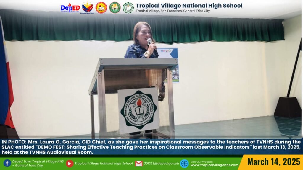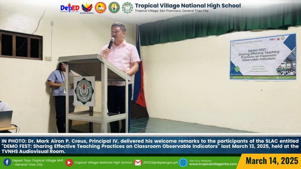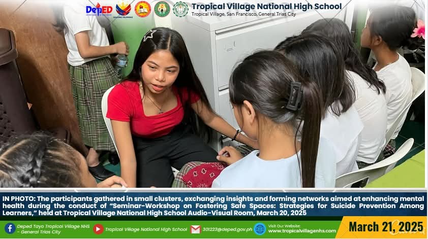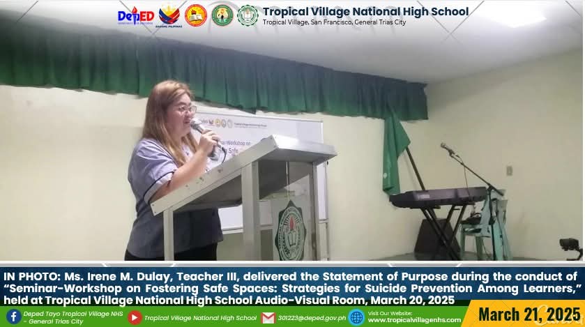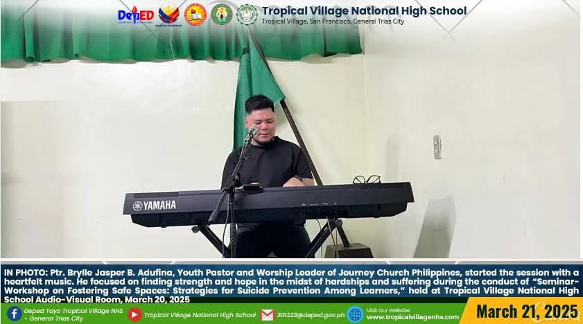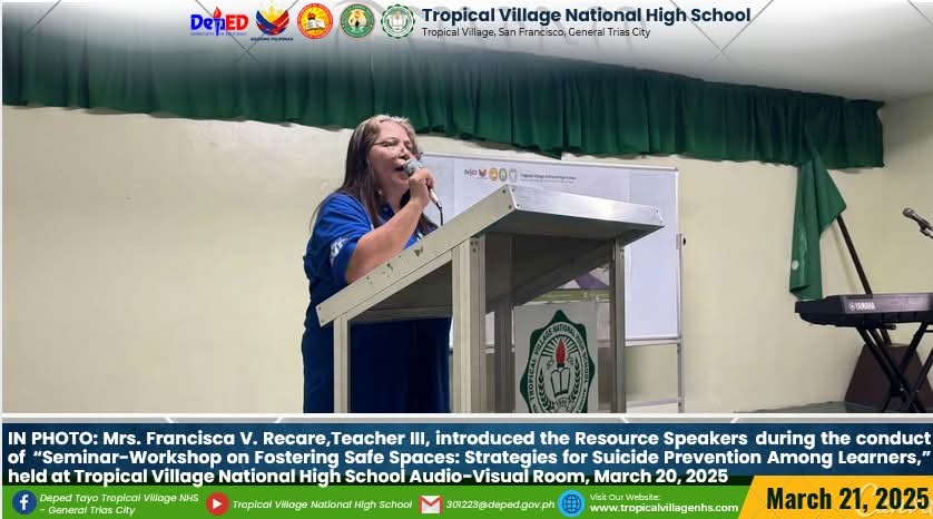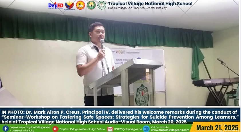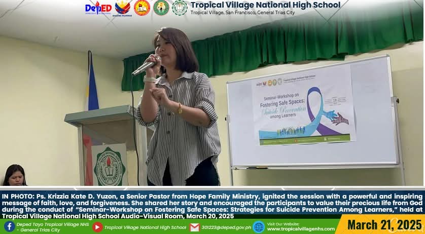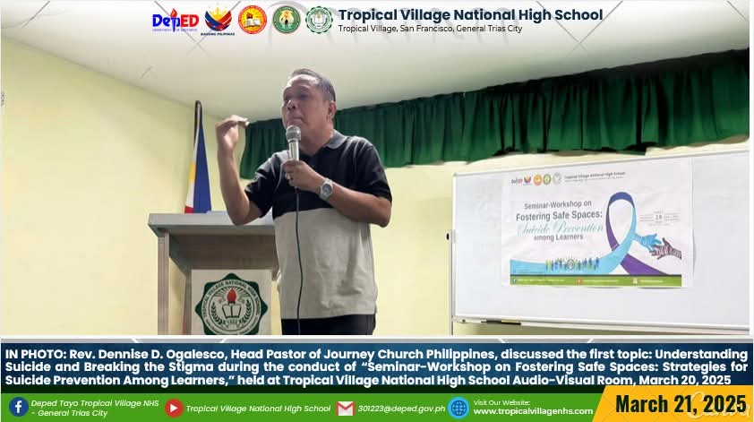 On March 20, 2025, Tropical Village National High School excitedly participated with a sense of purpose and urgency as educators, church leaders, and learners gathered for a pivotal seminar-workshop entitled “Fostering Safe Spaces: Strategies for Suicide Prevention Among Learners.” This aimed to raise awareness about the prevalence of suicide and its impact on individuals, families, and communities; equip participants with practical, evidence-based, and faith-based strategies for identifying individuals at risk; create a mental health plan, and promote mental wellness and resilience. The event commenced promptly at 9:00 AM in the School’s Audio‐Visual Room. The program began with the registration of all participants facilitated by Mrs. Emely B. Castro, Teacher II. Ms. Hadassah V. Recare, Teacher I and In‐Charge of the Ceremony, welcomed all participants. It was followed by singing the Philippine National Anthem and opening prayer through an audio-visual presentation. Mrs. Analyn V. Cabantac, Teacher I, presented the participants. Mark Airon P. Creus, Principal IV, delivered his opening remarks. In his opening remarks, Dr. Creus emphasized the importance to create better understanding, opportunities and systems to respond to the massive unmet need for mental health support, stating, “This is one of our measures para maiwasan ang ganitong insidente ( suicide) sa ating paaralan bawat bata dito sa Tropical Village National High School ay niyayakap anuman ang inyong kakayahan, anuman ang inyong limitasyon. Dahil ang gusto natin bawat bata magkaroon ng talino, magkaroon ng tikas, magkaroon ng tapang dahil iyon ang tatak natin bilang isang Tropicalian.” This was followed by the Statement of Purpose delivered by Ms Irene M. Dulay,Teacher III, who outlined the objectives of the seminar. After the statement of purpose, the workshop commenced with an inspiring keynote address by Rev. Dennise D. Ogalesco, Head Pastor of Journey Church Philippines, located at General Trias City, Cavite. He discussed the first topic: Understanding Suicide and Breaking the Stigma. He is also an advocate for youth mental health. His words resonated deeply as he shared poignant Statistics and personal stories that highlighted the critical need for safe spaces where learners can express their feelings without fear of judgment. The second speaker Ptr. Ruther M. Urquia, Associate Pastor of Faith‐Life South, discussed the second topic about Identifying Warning Signs and Offering Support. He also emphasized the need to have a deep connection or relationship to God, in order for us to avoid being suicidal. After the second speaker, the participants had their lunch at 12:00 NN. It was resumed at 12: 30 NN. The third speaker, Ptr. Brylle Jasper B. Adufina, Youth Pastor and Worship Leader of Journey Church Philippines, started the session with a heartfelt music. He focused on finding strength and hope in the midst of hardships and suffering. The last speaker, Ps. Krizzia Kate D. Yuzon, a Senior Pastor from Hope Family Ministry, ignited the session with a powerful and inspiring message of faith, love, and forgiveness. She shared her story and encouraged the participants to value their precious life from God.