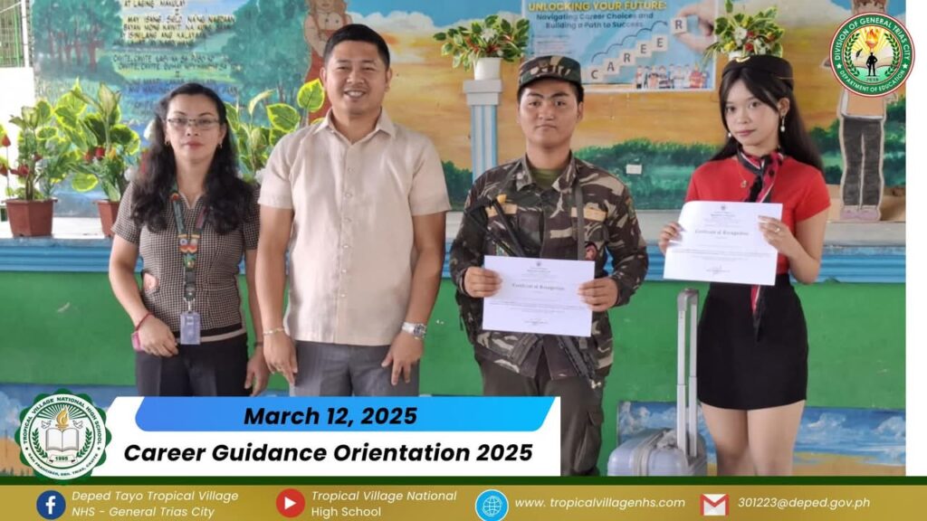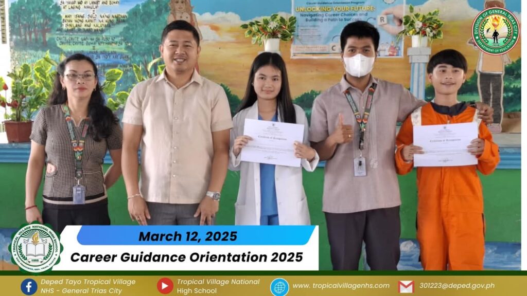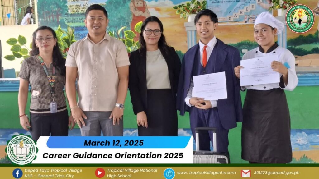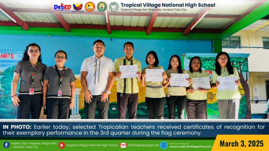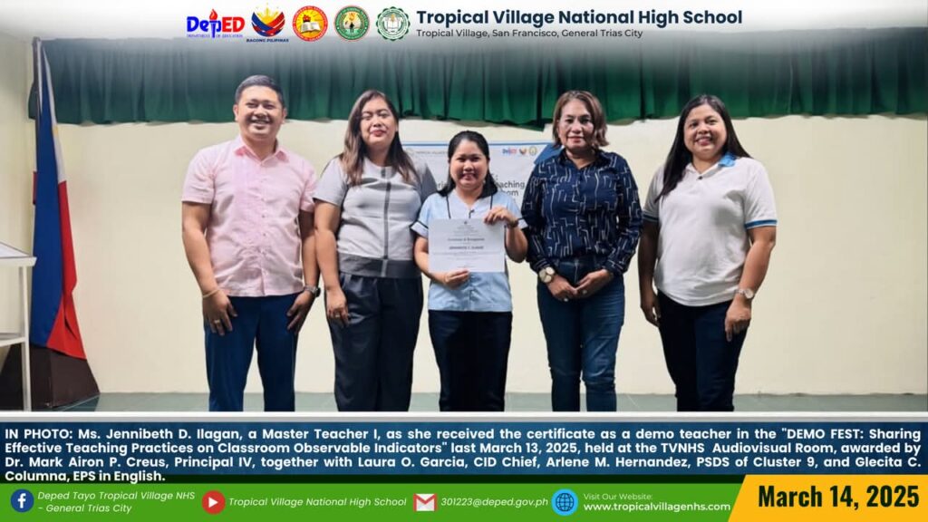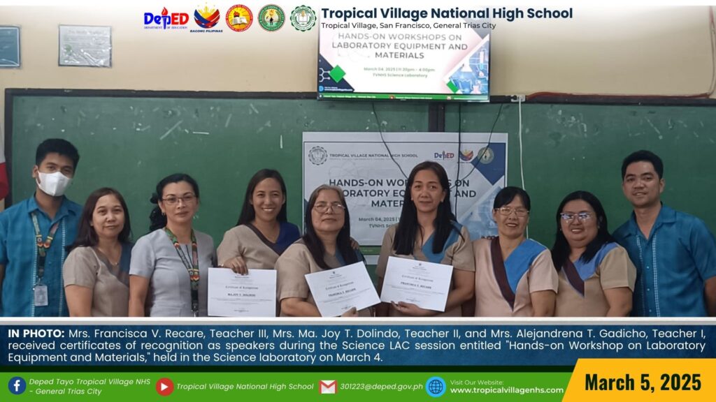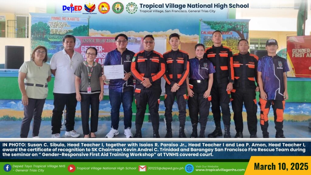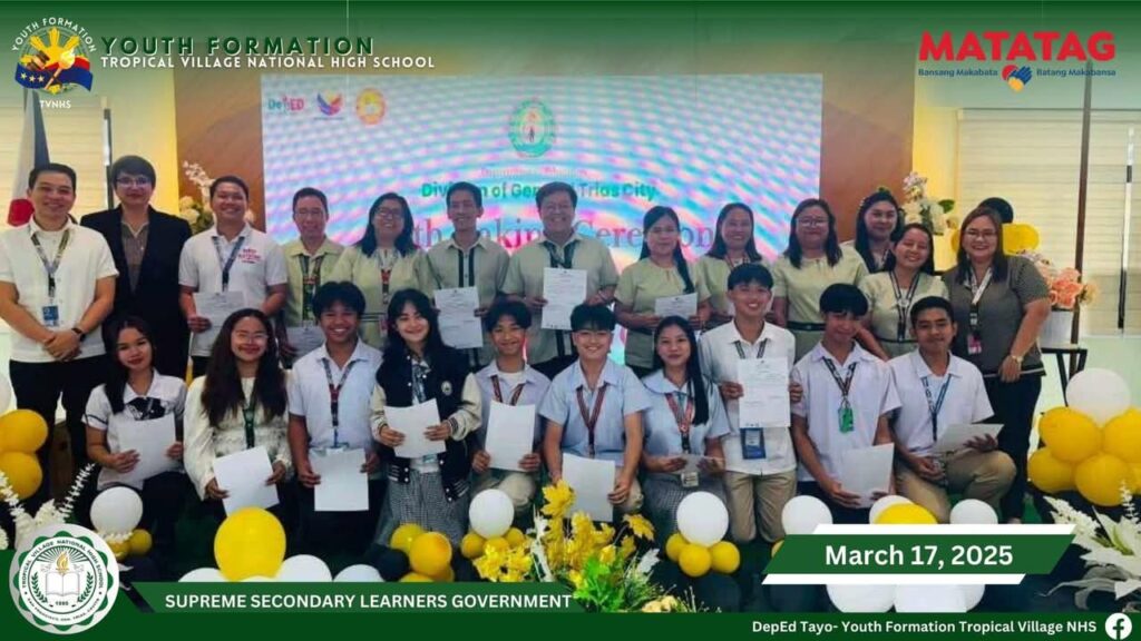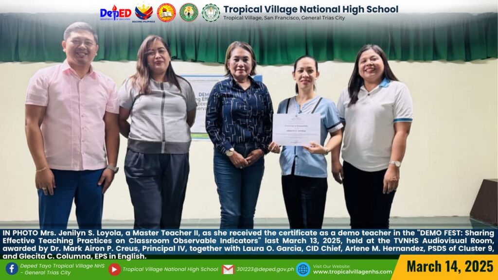 On March 20, 2025, Tropical Village National High School excitedly participated with a sense of purpose and urgency as educators, church leaders, and learners gathered for a pivotal seminar-workshop entitled “Fostering Safe Spaces: Strategies for Suicide Prevention Among Learners.” This aimed to raise awareness about the prevalence of suicide and its impact on individuals, families, and communities; equip participants with practical, evidence-based, and faith-based strategies for identifying individuals at risk; create a mental health plan, and promote mental wellness and resilience. The event commenced promptly at 9:00 AM in the School’s Audio‐Visual Room. The program began with the registration of all participants facilitated by Mrs. Emely B. Castro, Teacher II. Ms. Hadassah V. Recare, Teacher I and In‐Charge of the Ceremony, welcomed all participants. It was followed by singing the Philippine National Anthem and opening prayer through an audio-visual presentation. Mrs. Analyn V. Cabantac, Teacher I, presented the participants. Mark Airon P. Creus, Principal IV, delivered his opening remarks. In his opening remarks, Dr. Creus emphasized the importance to create better understanding, opportunities and systems to respond to the massive unmet need for mental health support, stating, “This is one of our measures para maiwasan ang ganitong insidente ( suicide) sa ating paaralan bawat bata dito sa Tropical Village National High School ay niyayakap anuman ang inyong kakayahan, anuman ang inyong limitasyon. Dahil ang gusto natin bawat bata magkaroon ng talino, magkaroon ng tikas, magkaroon ng tapang dahil iyon ang tatak natin bilang isang Tropicalian.” This was followed by the Statement of Purpose delivered by Ms Irene M. Dulay,Teacher III, who outlined the objectives of the seminar. After the statement of purpose, the workshop commenced with an inspiring keynote address by Rev. Dennise D. Ogalesco, Head Pastor of Journey Church Philippines, located at General Trias City, Cavite. He discussed the first topic: Understanding Suicide and Breaking the Stigma. He is also an advocate for youth mental health. His words resonated deeply as he shared poignant Statistics and personal stories that highlighted the critical need for safe spaces where learners can express their feelings without fear of judgment. The second speaker Ptr. Ruther M. Urquia, Associate Pastor of Faith‐Life South, discussed the second topic about Identifying Warning Signs and Offering Support. He also emphasized the need to have a deep connection or relationship to God, in order for us to avoid being suicidal. After the second speaker, the participants had their lunch at 12:00 NN. It was resumed at 12: 30 NN. The third speaker, Ptr. Brylle Jasper B. Adufina, Youth Pastor and Worship Leader of Journey Church Philippines, started the session with a heartfelt music. He focused on finding strength and hope in the midst of hardships and suffering. The last speaker, Ps. Krizzia Kate D. Yuzon, a Senior Pastor from Hope Family Ministry, ignited the session with a powerful and inspiring message of faith, love, and forgiveness. She shared her story and encouraged the participants to value their precious life from God.