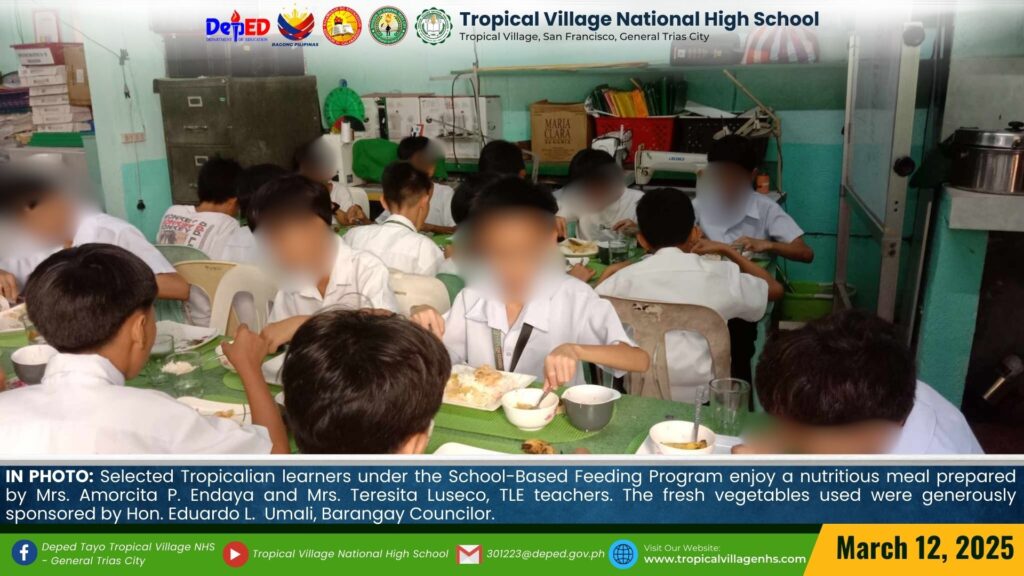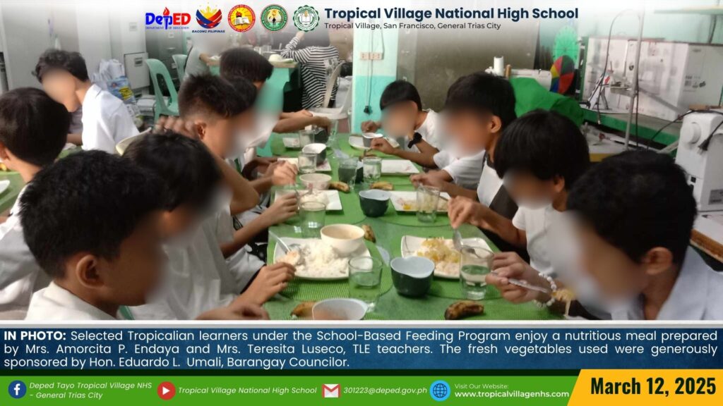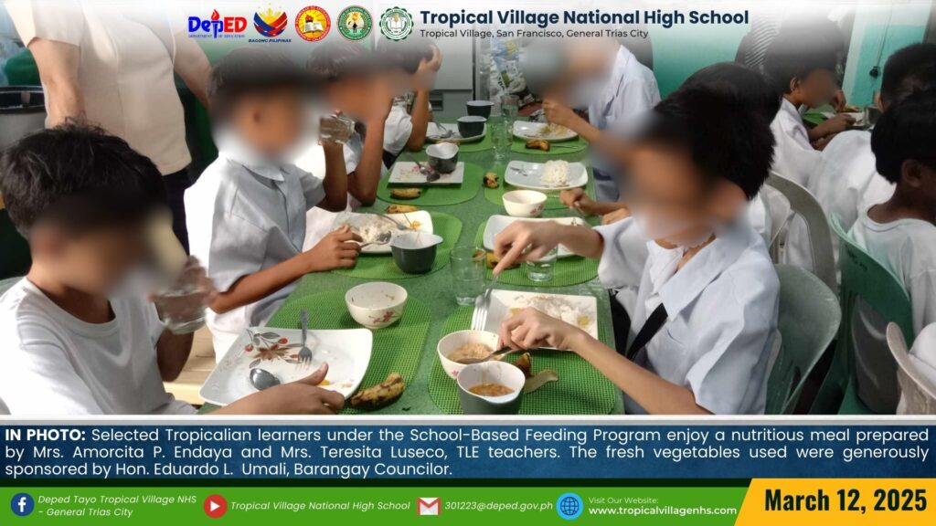 Selected Tropicalian learners under the School-Based Feeding Program enjoy a nutritious meal prepared by Mrs. Amorcita P. Endaya and Mrs. Teresita M. Luseco, TLE teachers. The fresh vegetables used were generously sponsored by Hon. Eduardo L. Umali, Barangay Councilor.