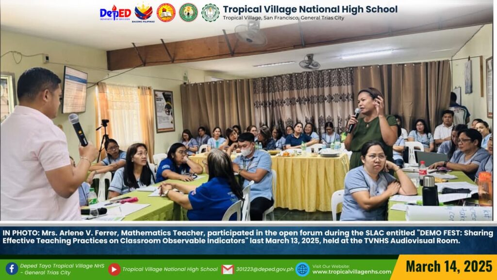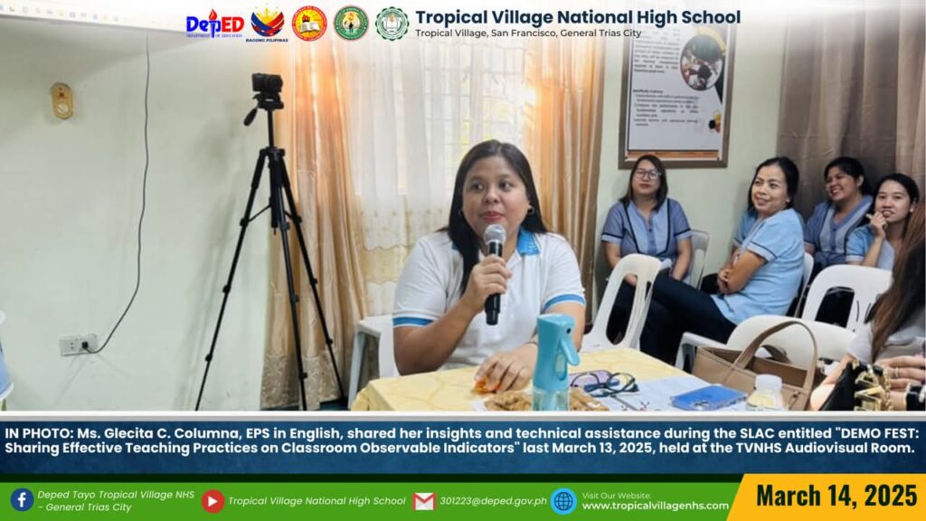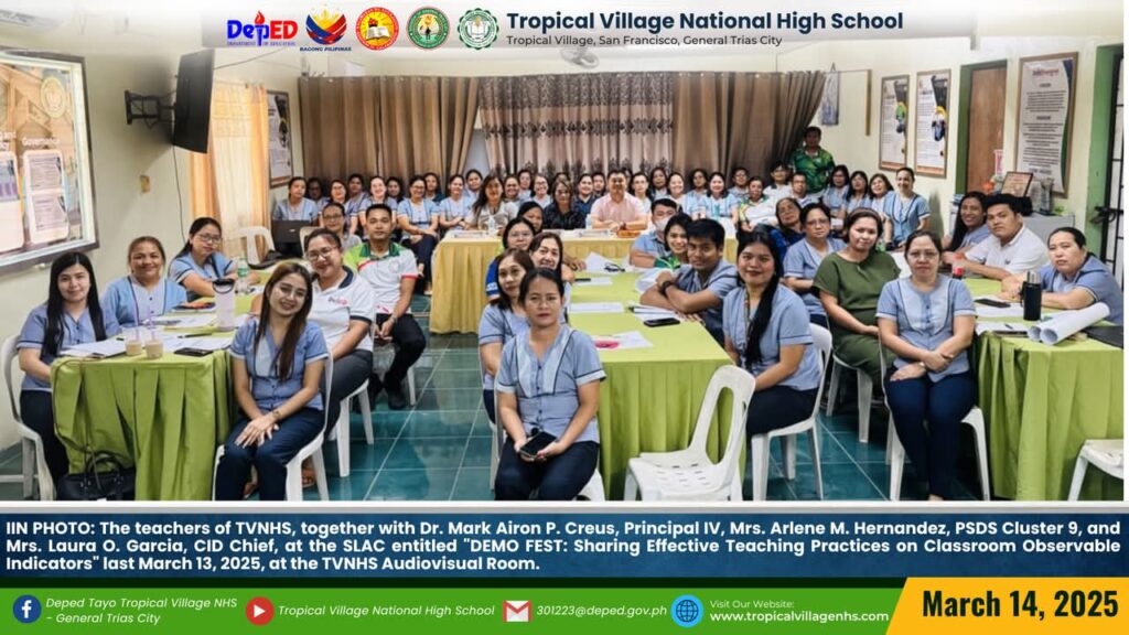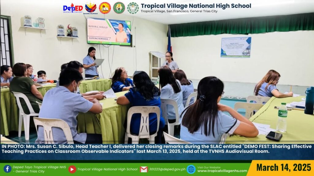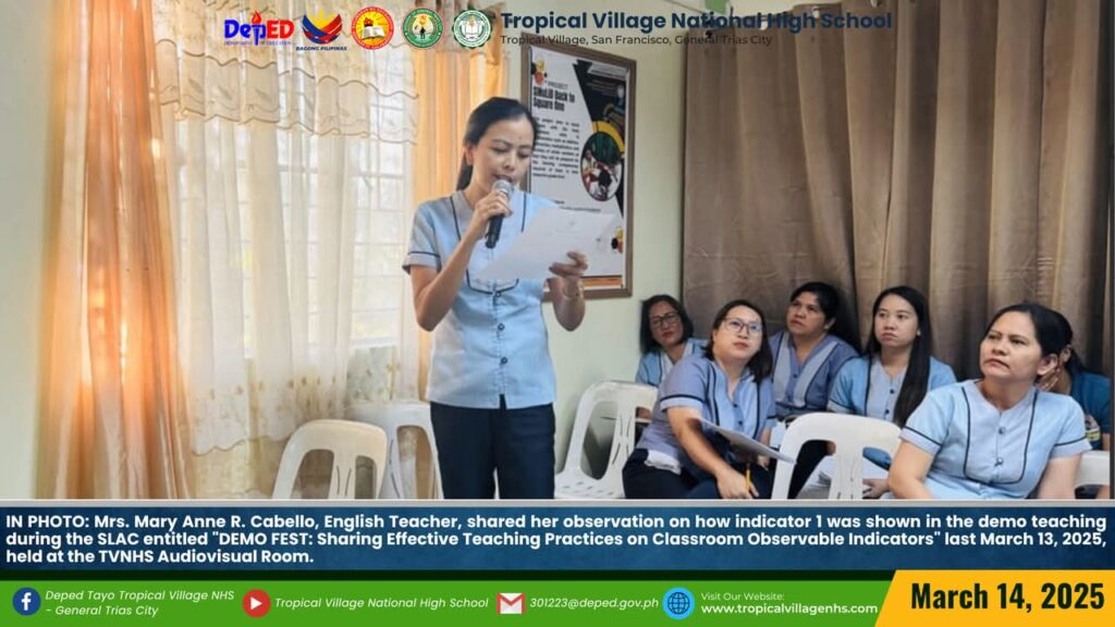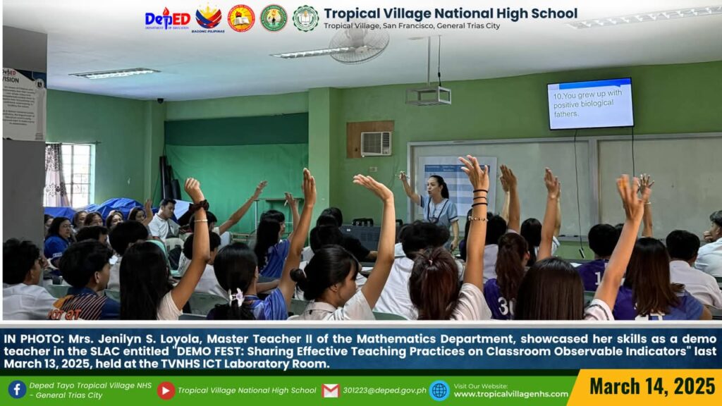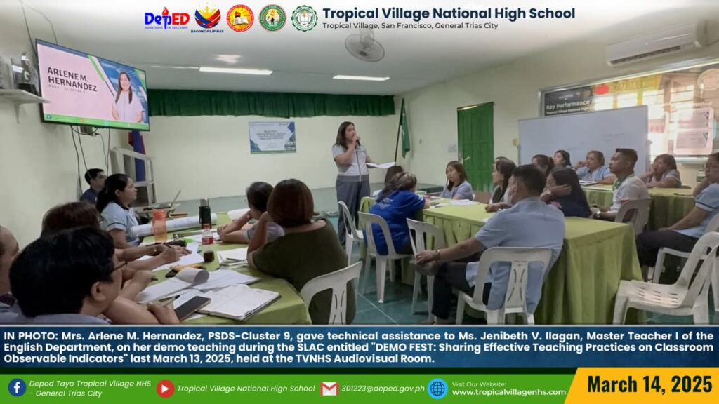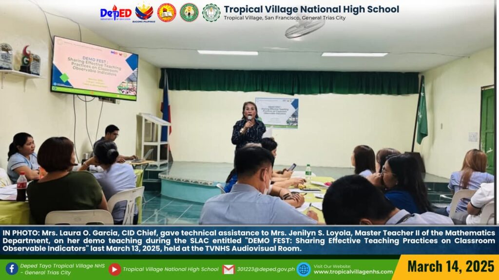 IN PHOTO: Mrs. Jenilyn S. Loyola, Master Teacher II of the Mathematics Department and Ms. Jennibeth V. Ilagan, Master Teacher I of the English Department, showcased their skills as a demo teachers during the SLAC entitled “DEMO FEST: Sharing Effective Teaching Practices on Classroom Observable Indicators” last March 13, 2025, held at the TVNHS Audiovisual and ICT Laboratory Room.