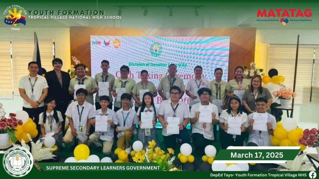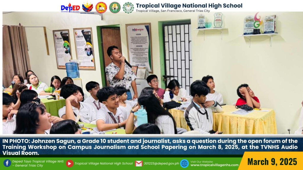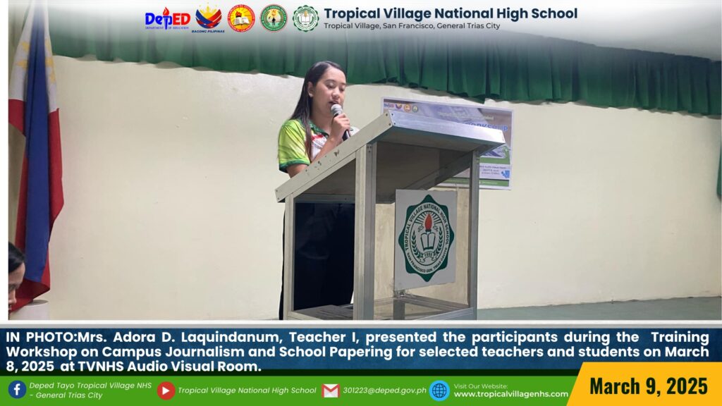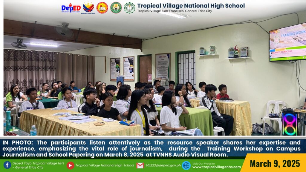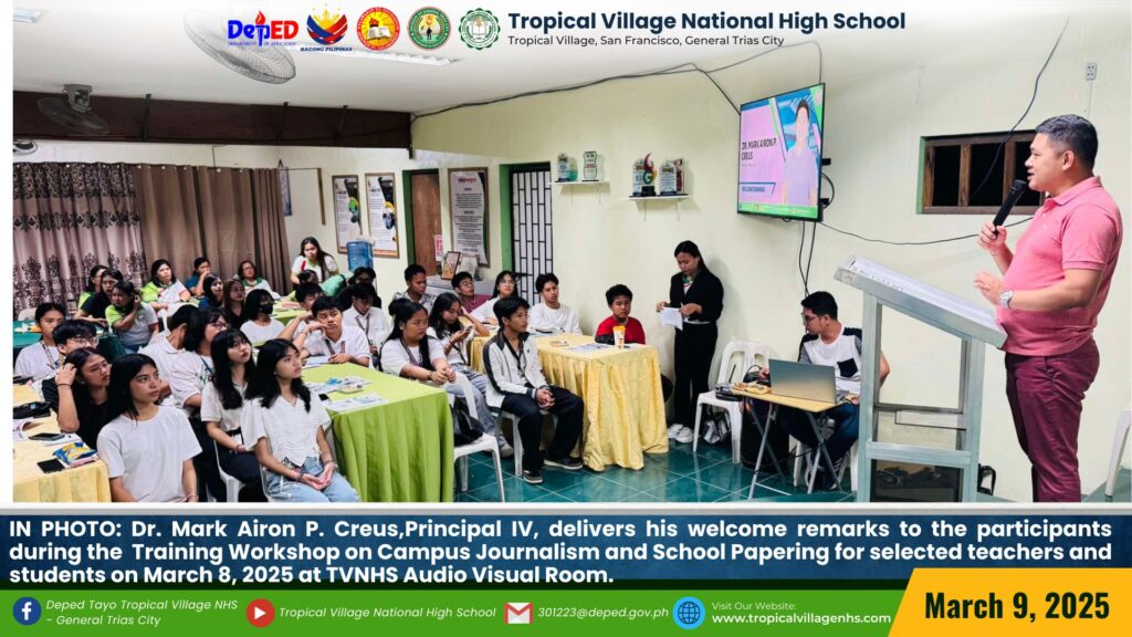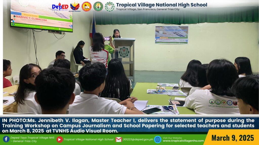 Aiming to equip participants with the skills and techniques needed to craft compelling newspaper articles, write clear and engaging content, and edit effectively, Tropical Village National High School held a Training Workshop on Campus Journalism and School Papering for selected teachers and students. on March 8, 2025, at TVNHS Audio Visual Room.
