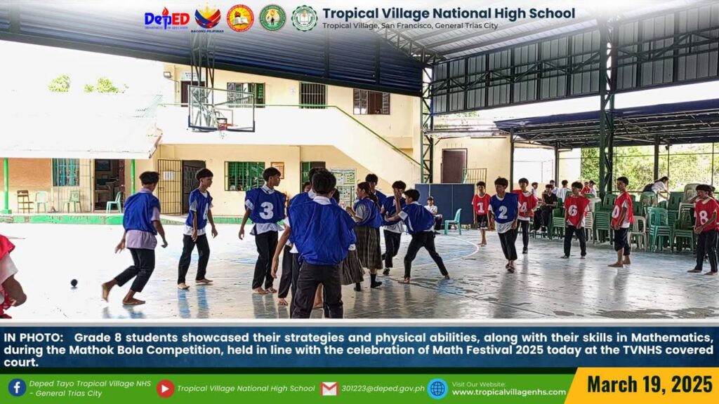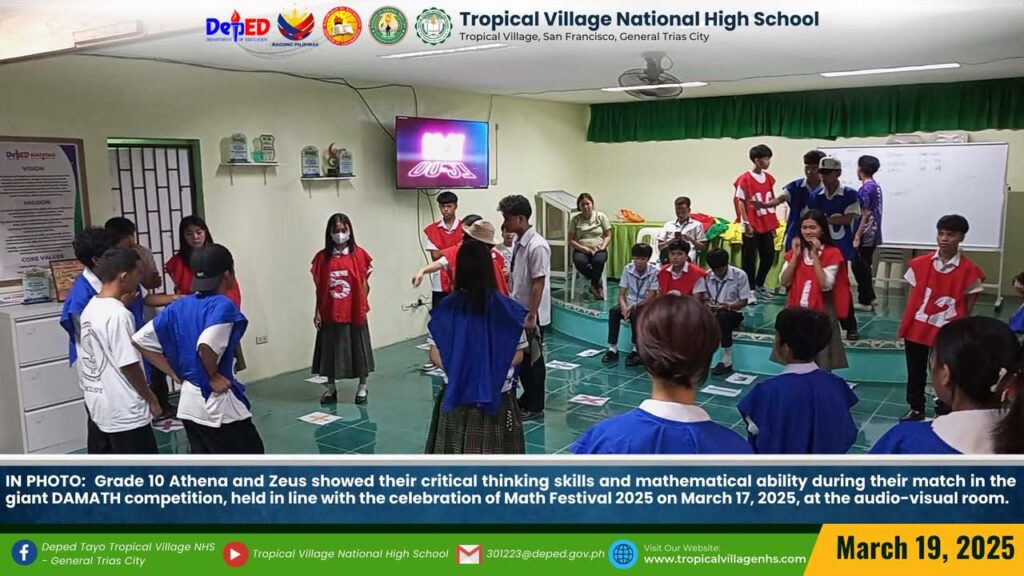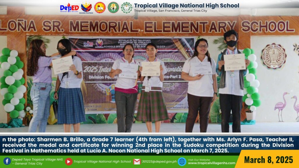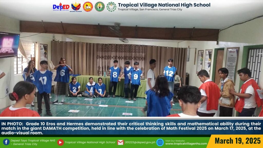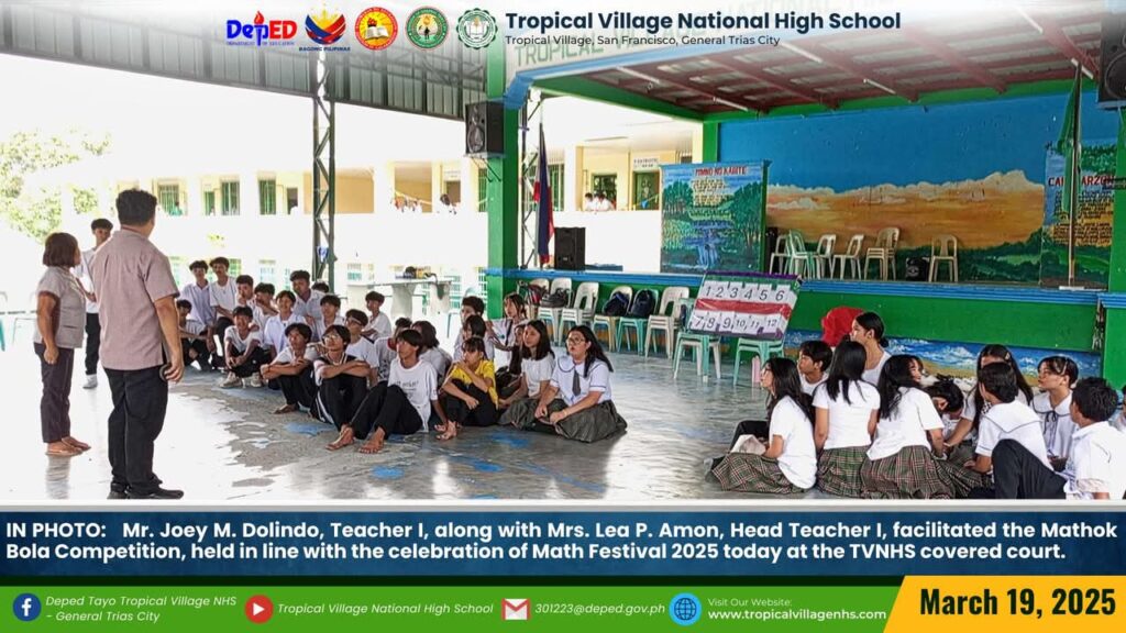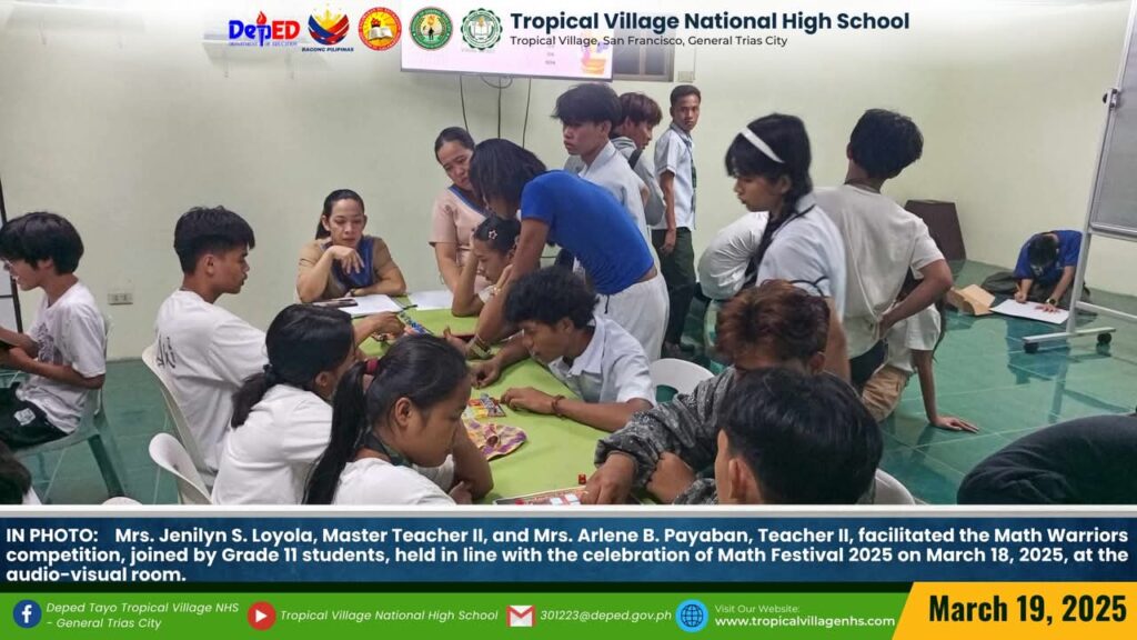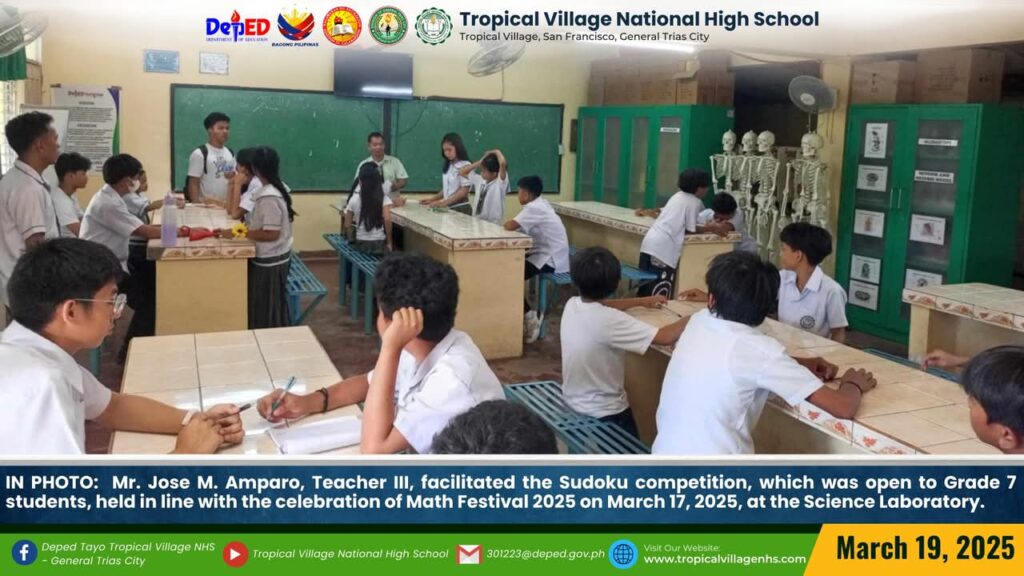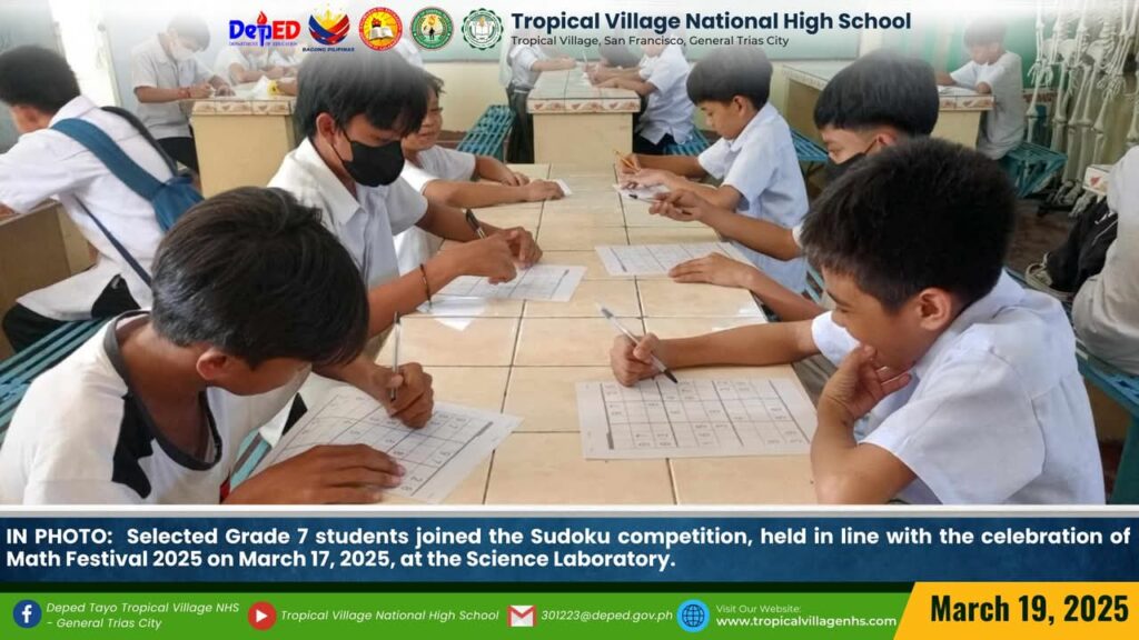 The Mathematics Department, under the leadership of Lea P. Amon, Head Teacher I, together with all the mathematics teachers, organized a series of activities to celebrate Math Festival 2025. Among the activities were Damath, Sudoku, Math Quiz Bee, Poster-Making Contest, Math Warriors, and Mathok Bola. Students from grades 7 to 11 participated in the event, which started on March 17 and will continue onwards.