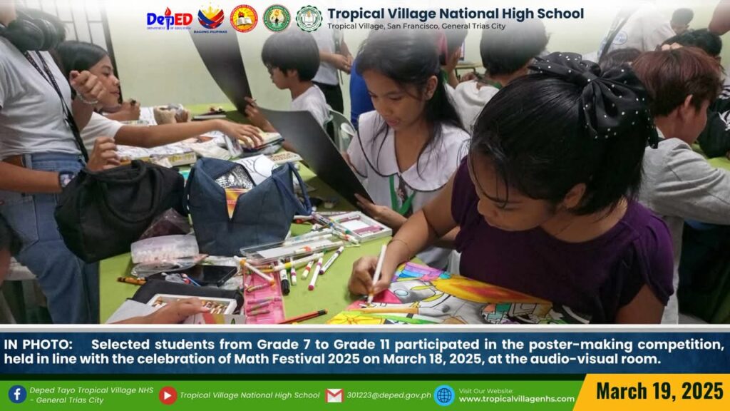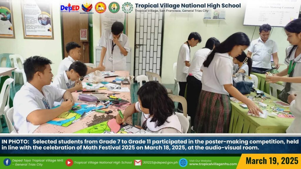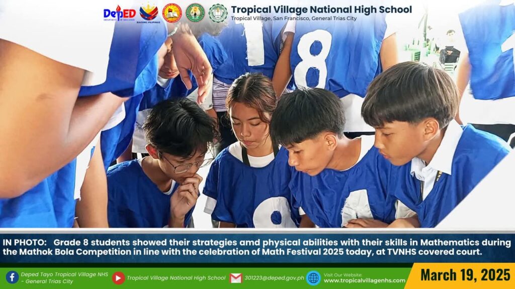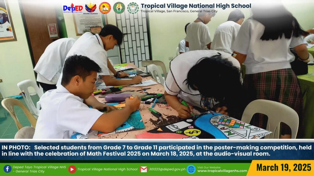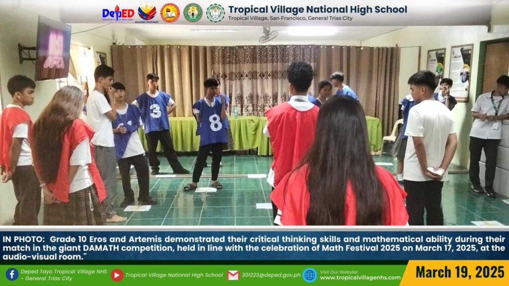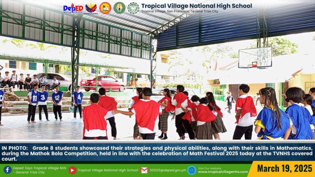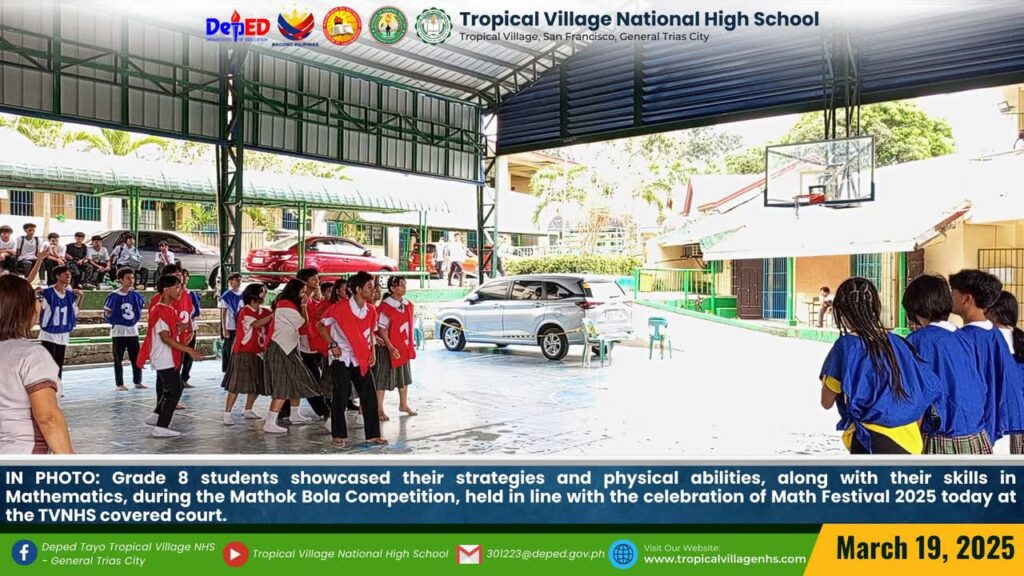 The Mathematics Department, under the leadership of Lea P. Amon, Head Teacher I, together with all the mathematics teachers, organized a series of activities to celebrate Math Festival 2025. Among the activities were Damath, Sudoku, Math Quiz Bee, Poster-Making Contest, Math Warriors, and Mathok Bola. Students from grades 7 to 11 participated in the event, which started on March 17 and will continue onwards.