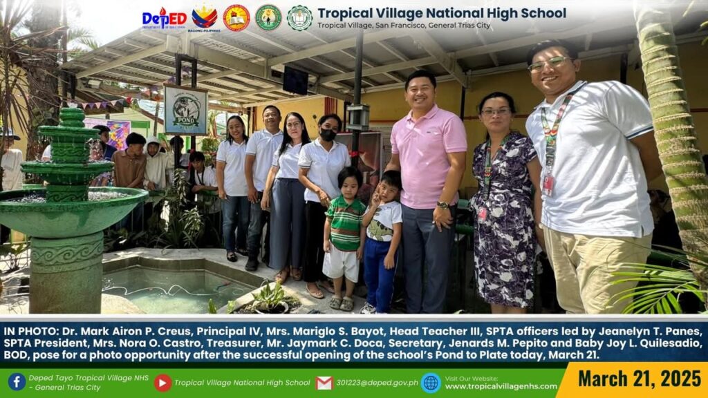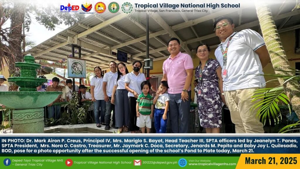 Dr. Mark Airon P. Creus, Principal IV, Mrs. Mariglo S. Bayot, Head Teacher III, SPTA officers led by Jeanelyn T. Panes, SPTA President, Mrs. Nora O. Castro, Treasurer, Mr. Jaymark C. Doca, Secretary, Jenards M. Pepito and Baby Joy L. Quilesadio, BOD, pose for a photo opportunity after the successful opening of the school’s Pond to Plate today, March 21.