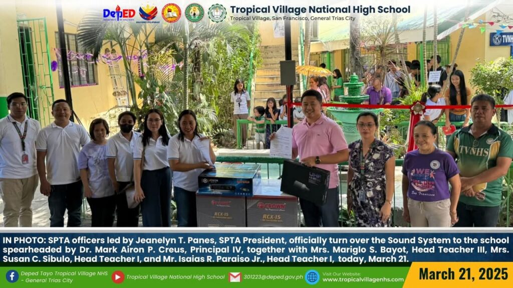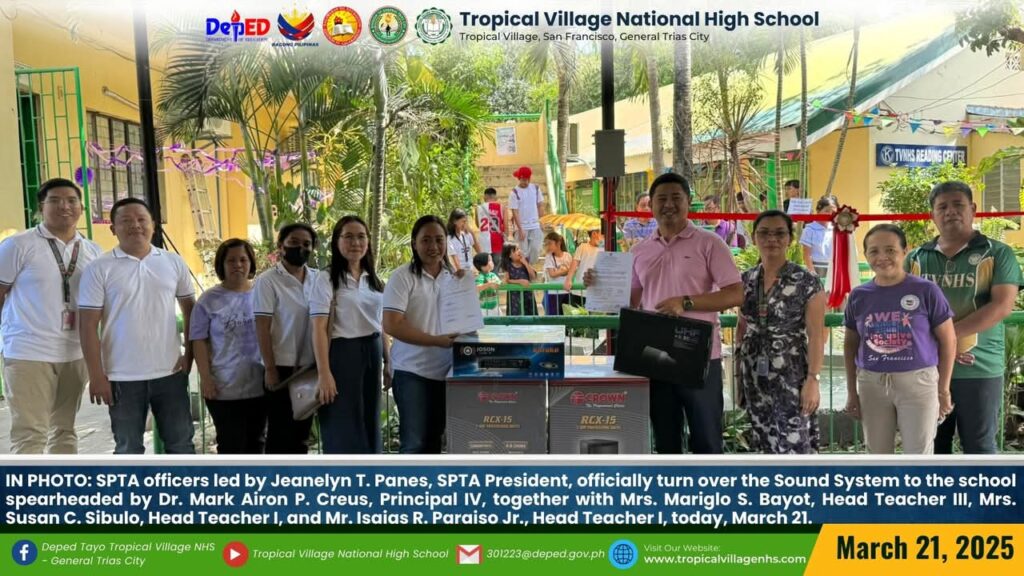 SPTA officers led by Mrs. Jeanelyn T. Panes, SPTA President, officially turn over the Sound System to the school spearheaded by Dr. Mark Airon P. Creus, Principal IV, together with Mrs. Mariglo S. Bayot, Head Teacher III, Mrs. Susan C. Sibulo, Head Teacher I, and Mr. Isaias R. Paraiso Jr., Head Teacher I, today, March 21.