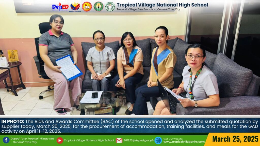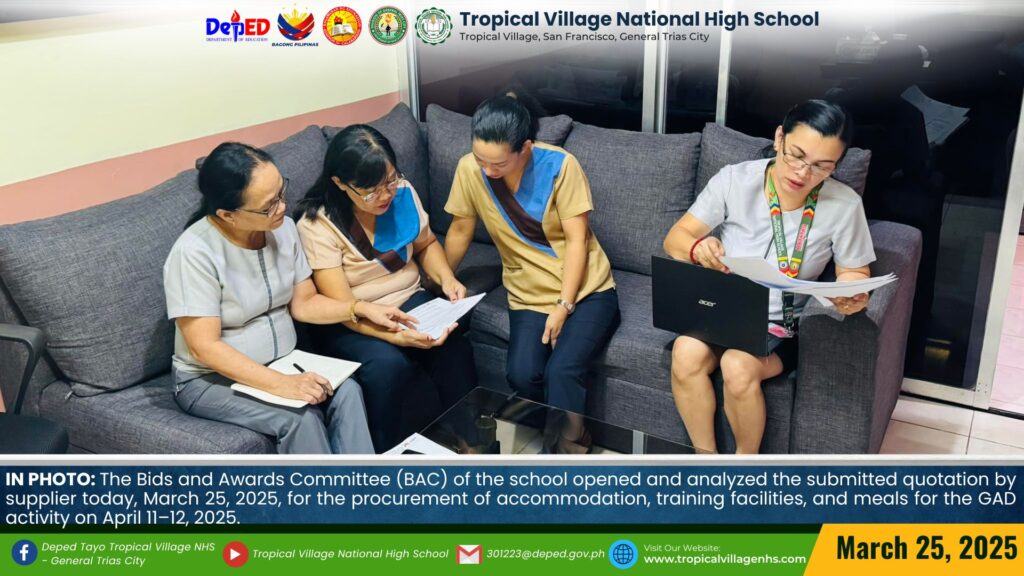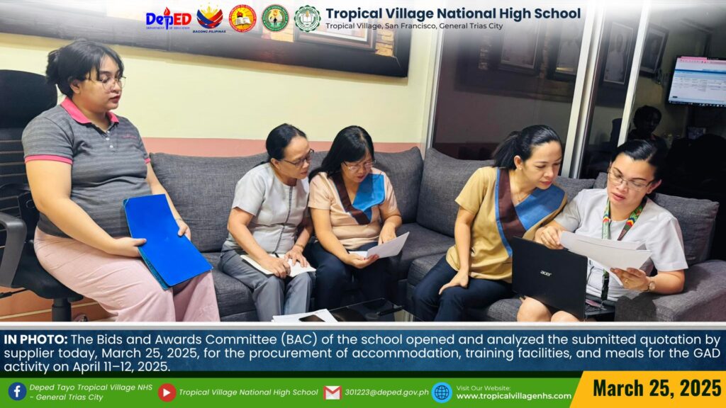 The Bids and Awards Committee (BAC) of the school opened and analyzed the submitted quotation by supplier today, March 25, 2025, for the procurement of accommodation, training facilities, and meals for the GAD activity on April 11–12, 2025.