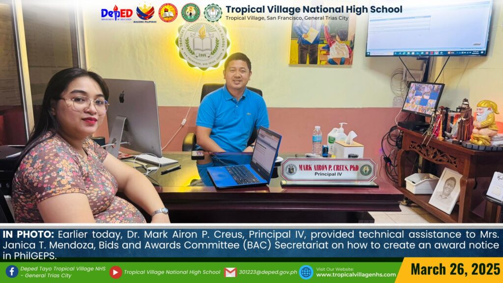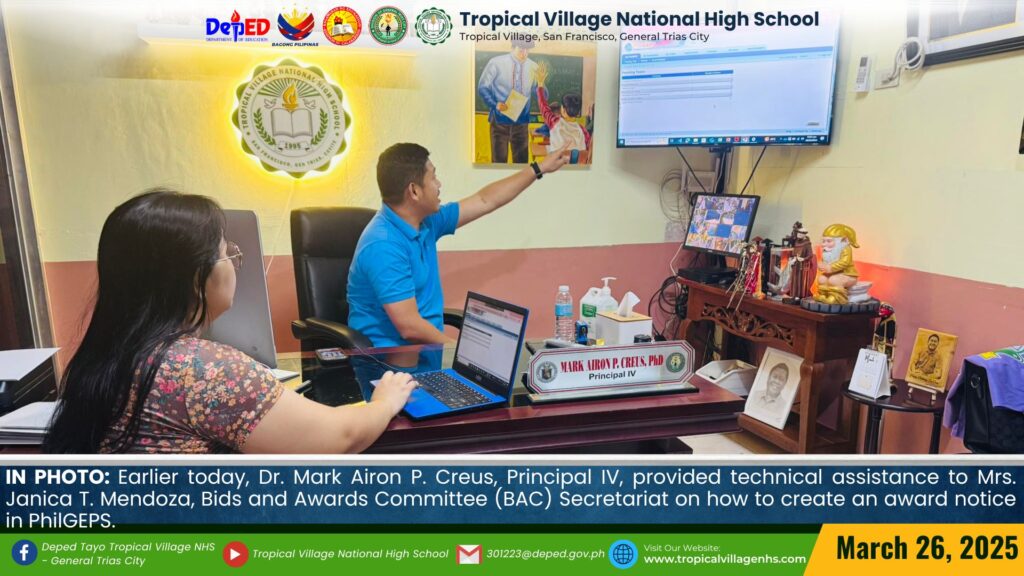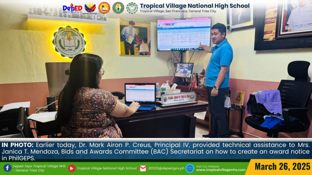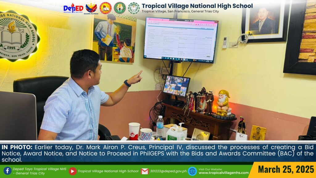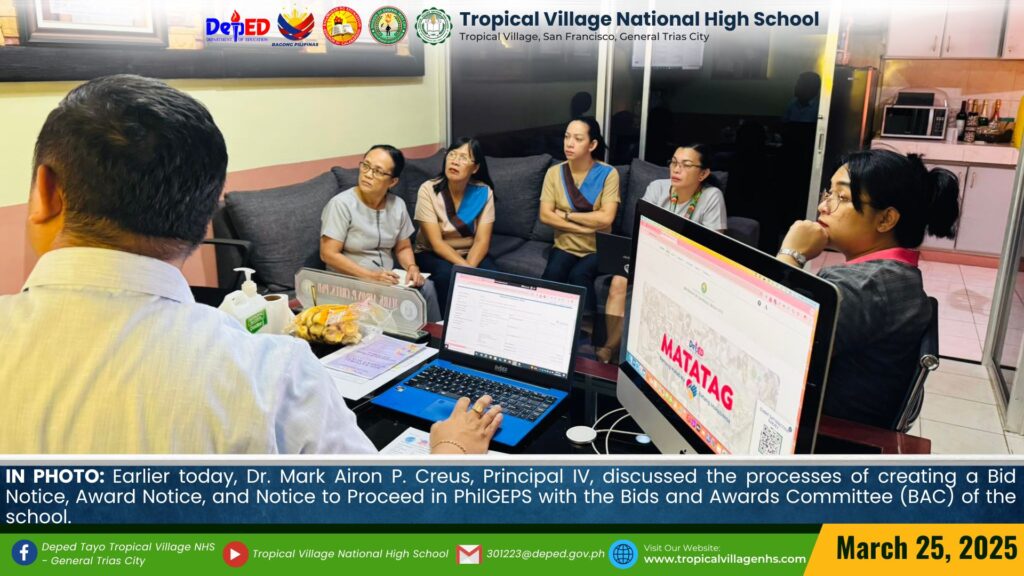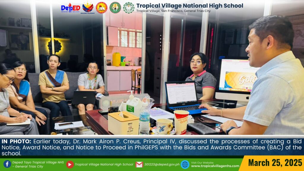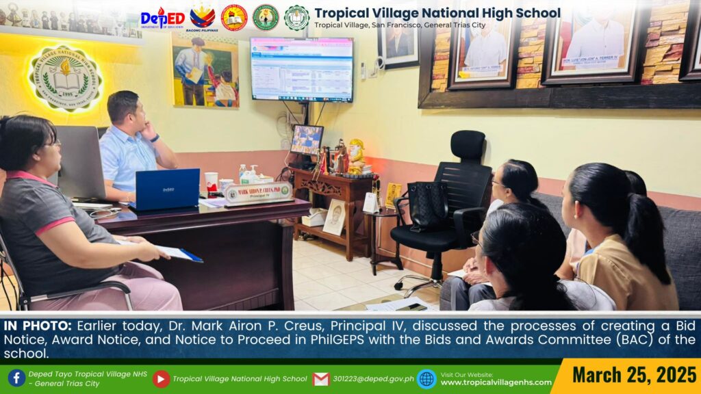 Earlier today, Dr. Mark Airon P. Creus, Principal IV, discussed the processes of creating a Bid Notice, Award Notice, and Notice to Proceed in PhilGEPS with the Bids and Awards Committee (BAC) of the school.
