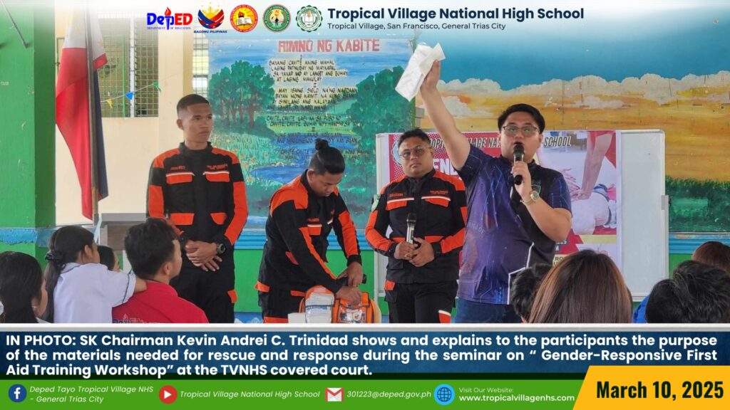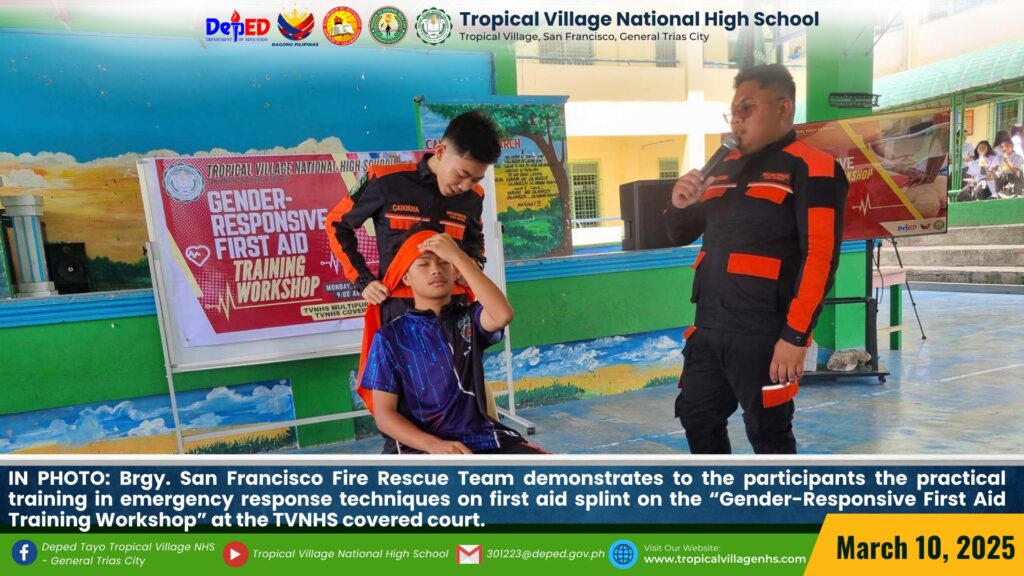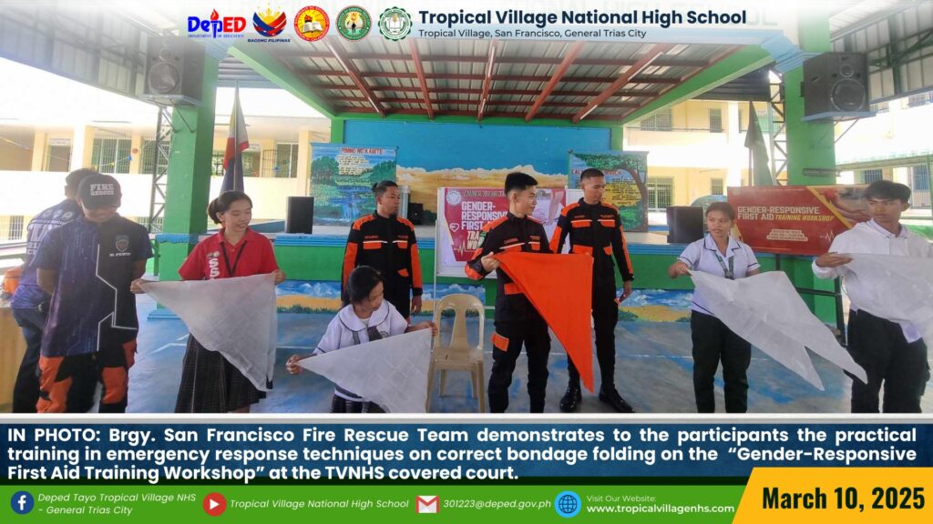 Brgy. San Francisco Fire Rescue Team demonstrates to the Tropicalian on how to respond effectively to medical emergencies and on how practical training in emergency response techniques on correct bondage folding on the “Gender-Responsive First Aid Training Workshop” at the TVNHS covered court on March 10, 2025.