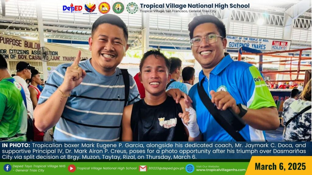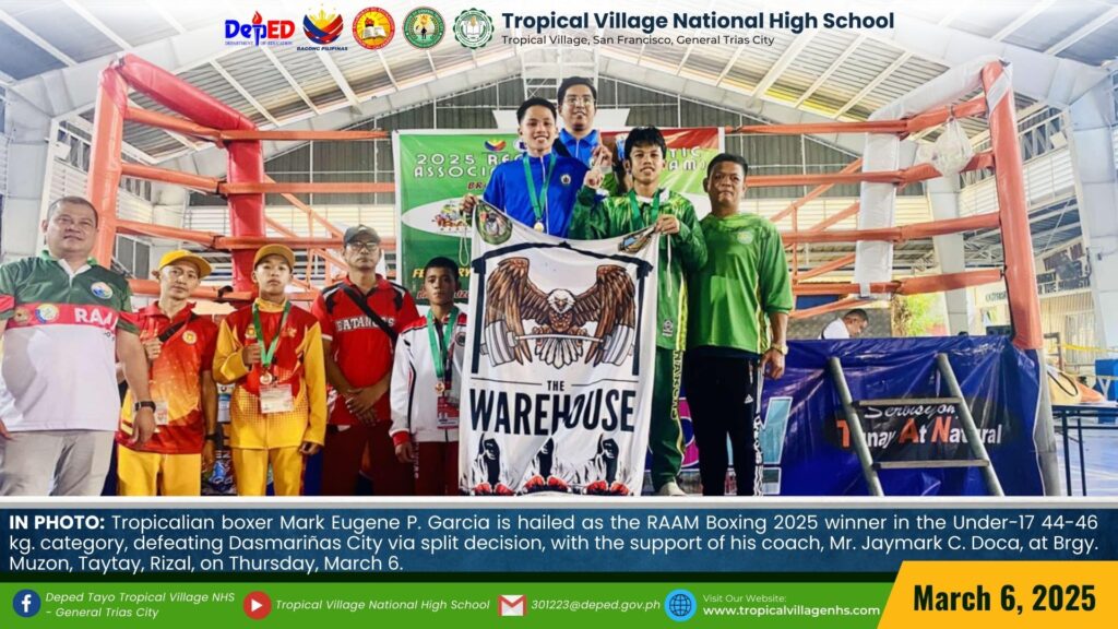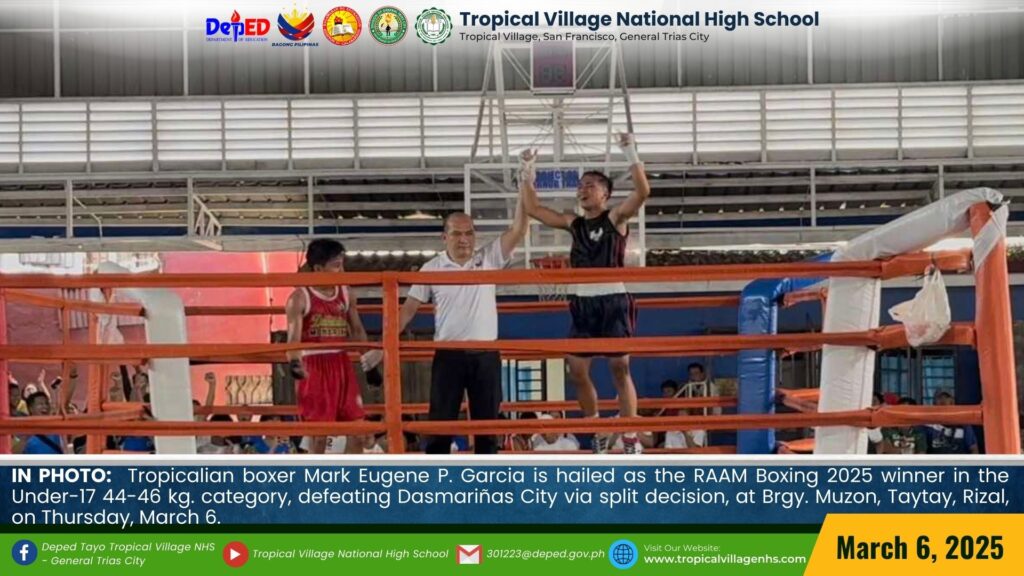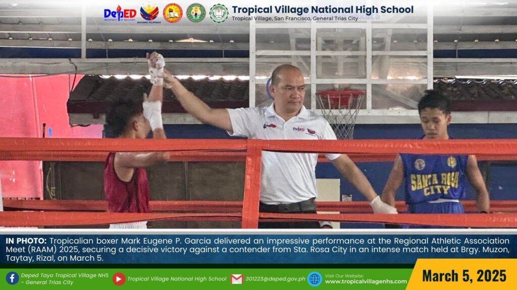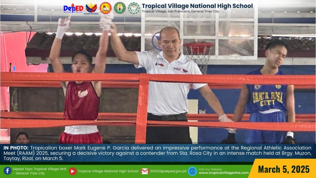 Tropicalian boxer Mark Eugene P. Garcia delivered an impressive performance at the Regional Athletic Association Meet (RAAM) 2025, securing a decisive victory against a contender from Sta. Rosa City in an intense match held at Brgy. Muzon, Taytay, Rizal, on March 5.