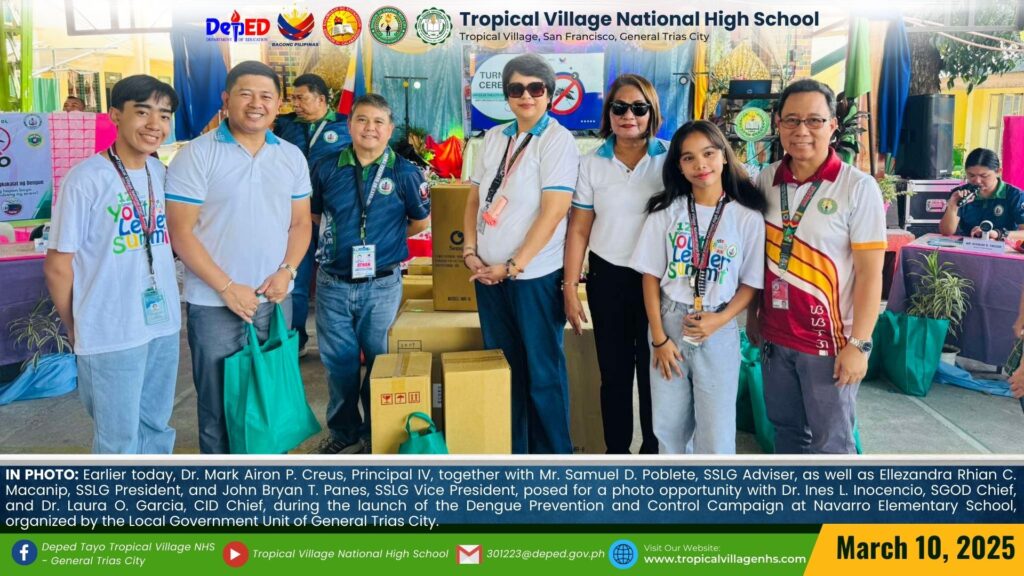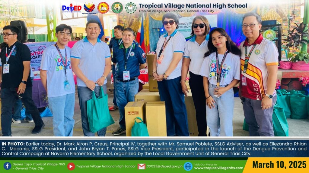 Earlier today, Dr. Mark Airon P. Creus, Principal IV, together with Mr. Samuel Poblete, SSLG Adviser, as well as Ellezandra Rhian C. Macanip, SSLG President, and John Bryan T. Panes, SSLG Vice President, participated in the launch of the Dengue Prevention and Control Campaign at Navarro Elementary School, organized by the Local Government Unit of General Trias City.