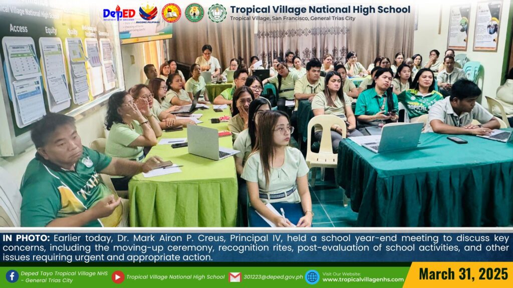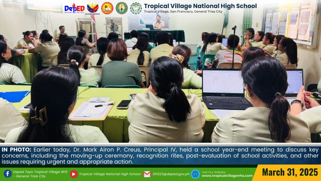 Earlier today, Dr. Mark Airon P. Creus, Principal IV, held a school year-end meeting to discuss key concerns, including the moving-up ceremony, recognition rites, post-evaluation of school activities, and other issues requiring urgent and appropriate action.
