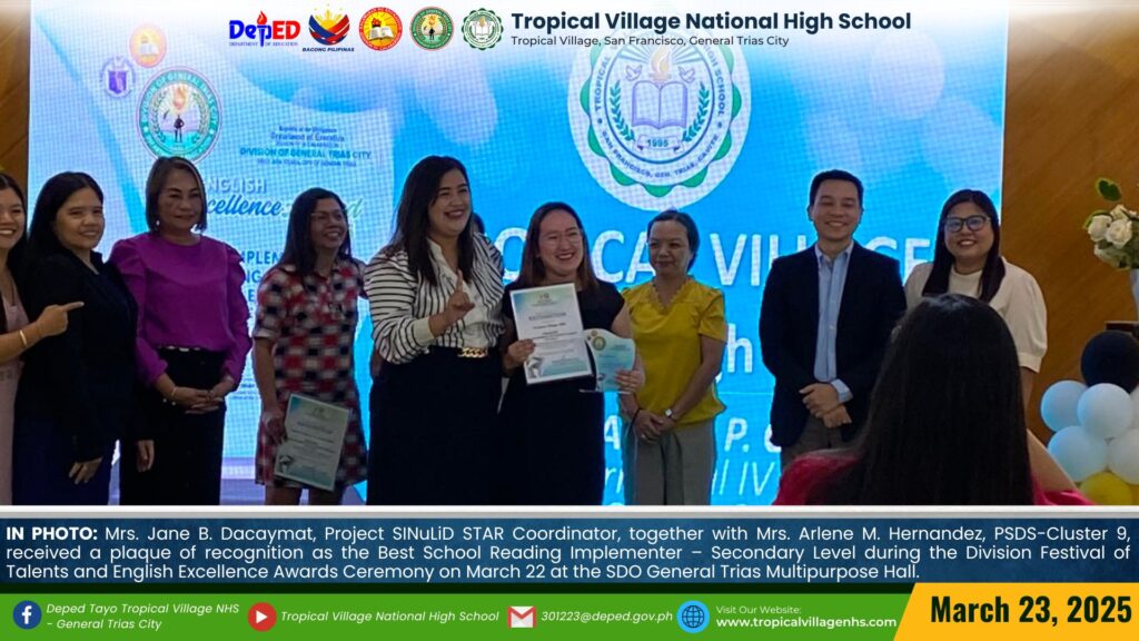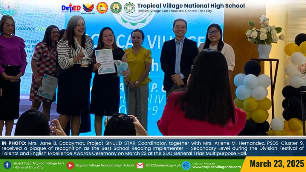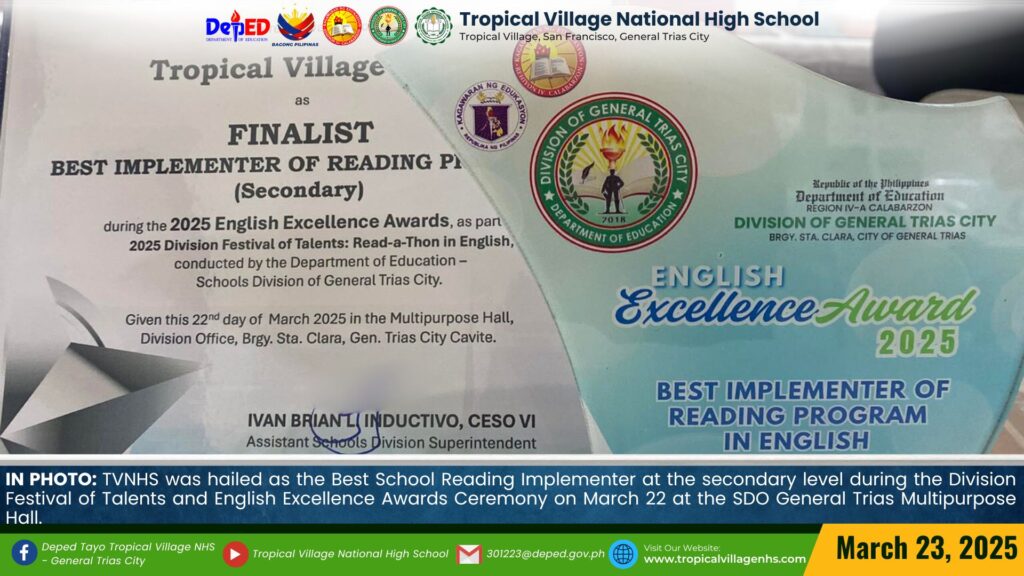 TVNHS was hailed as the Best School Reading Implementer at the secondary level during the Division Festival of Talents and English Excellence Awards Ceremony on March 22 at the SDO General Trias Multipurpose Hall.
