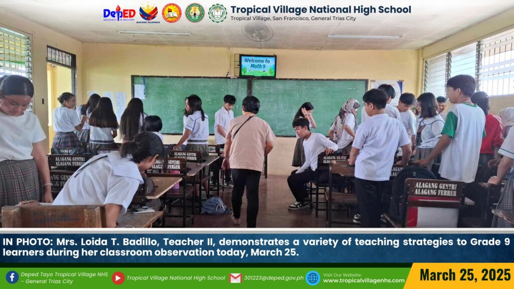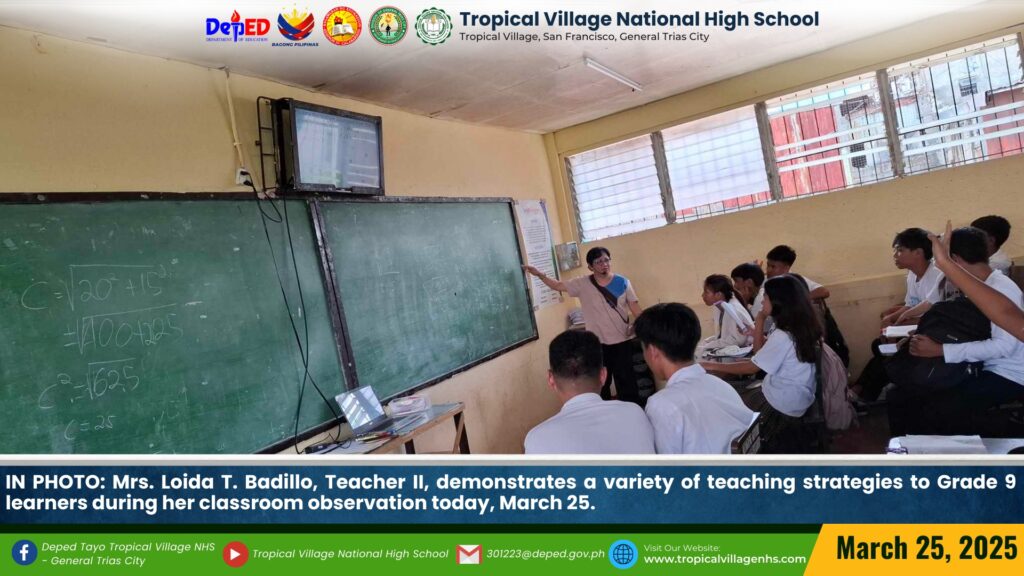 Mrs. Loida T. Badillo, Teacher II, demonstrates a variety of teaching strategies to Grade 9 learners during her classroom observation today, March 25.