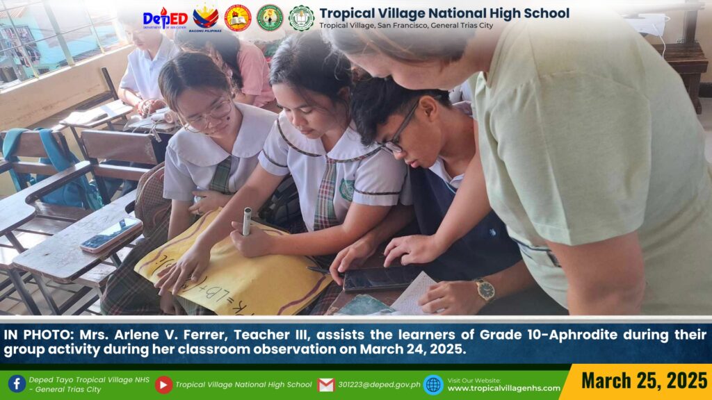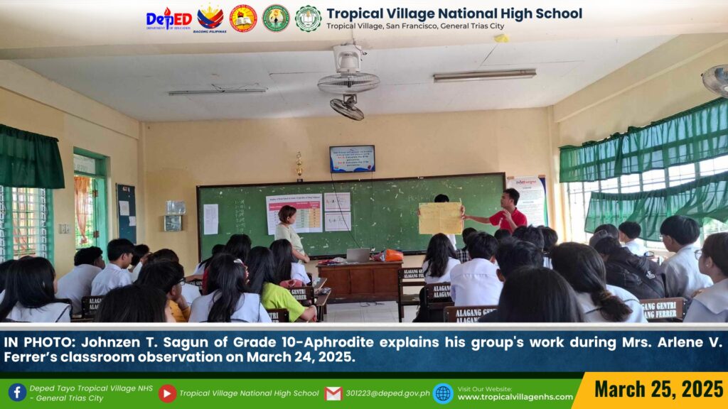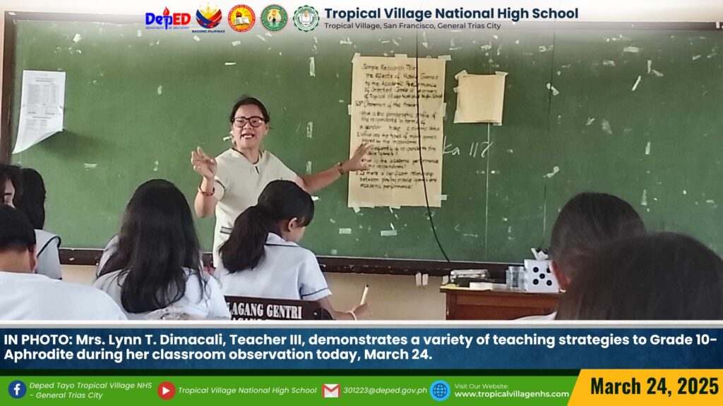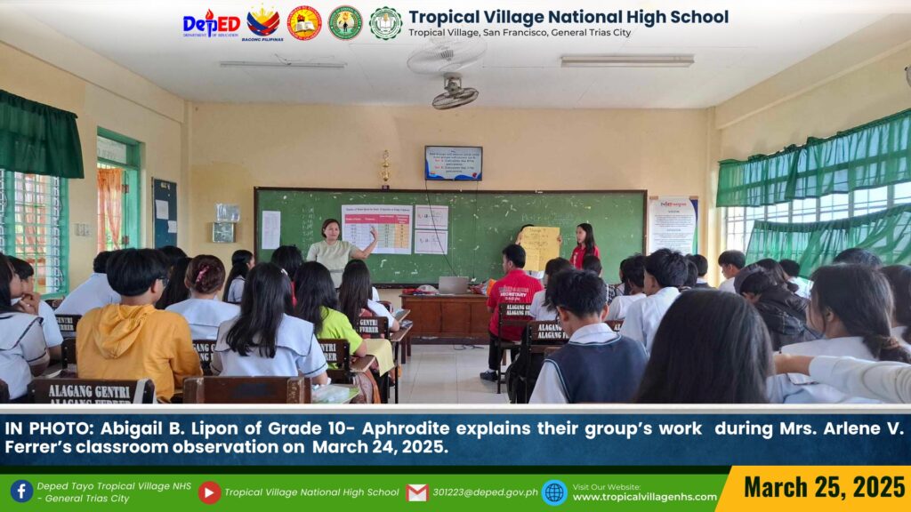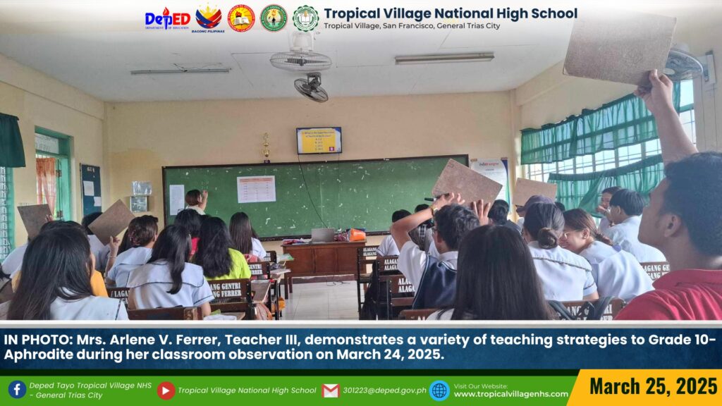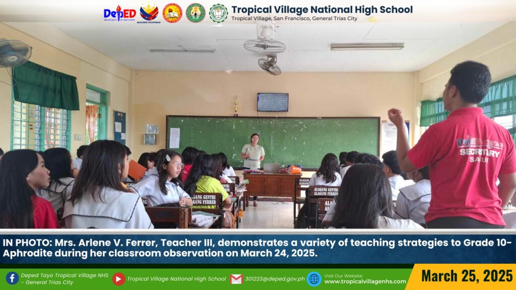Mrs. Arlene V. Ferrer, Teacher III, demonstrated a variety of teaching strategies to Grade 10-Aphrodite during her classroom observation on March 24, 2025.