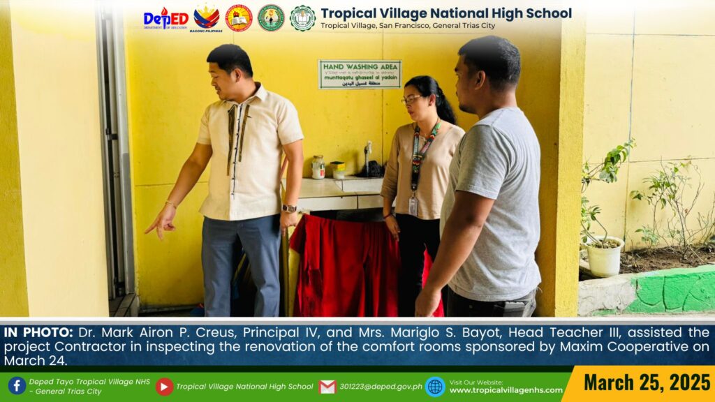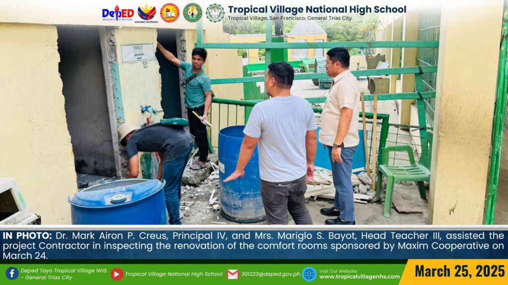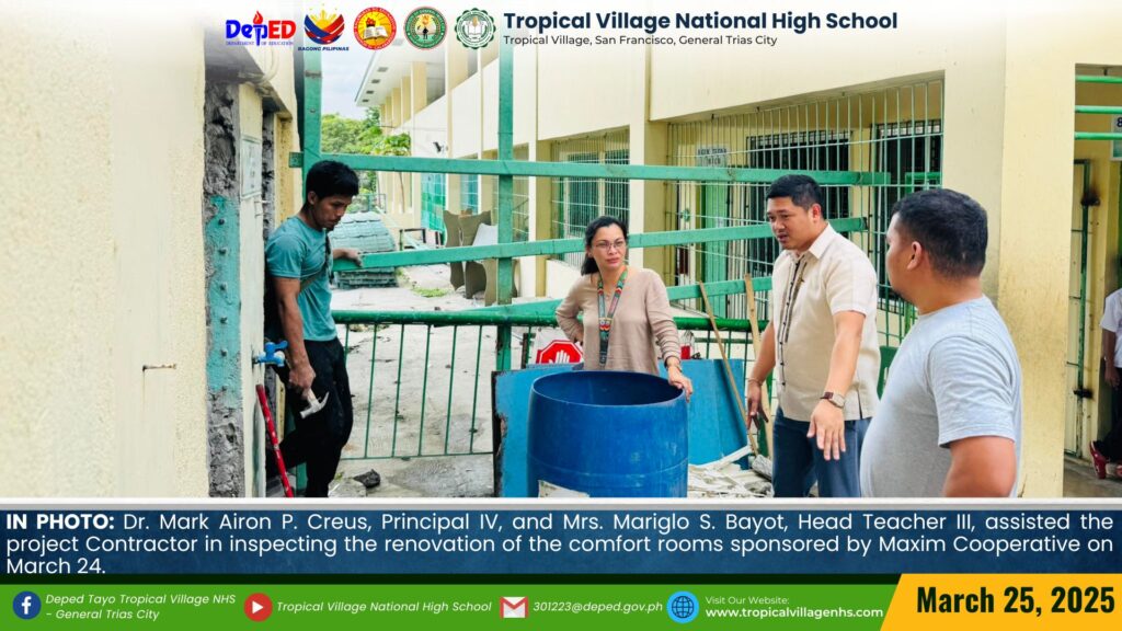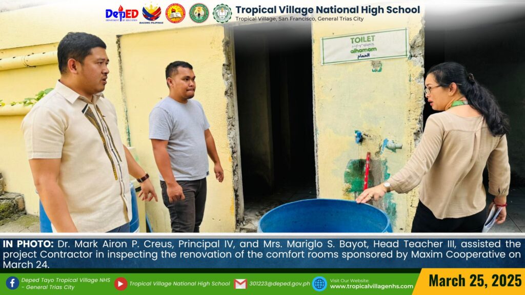 Dr. Mark Airon P. Creus, Principal IV, and Mrs. Mariglo S. Bayot, Head Teacher III, assisted the project Contractor in inspecting the renovation of the comfort rooms sponsored by Maxim Cooperative on March 24.