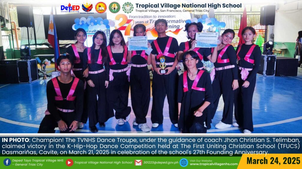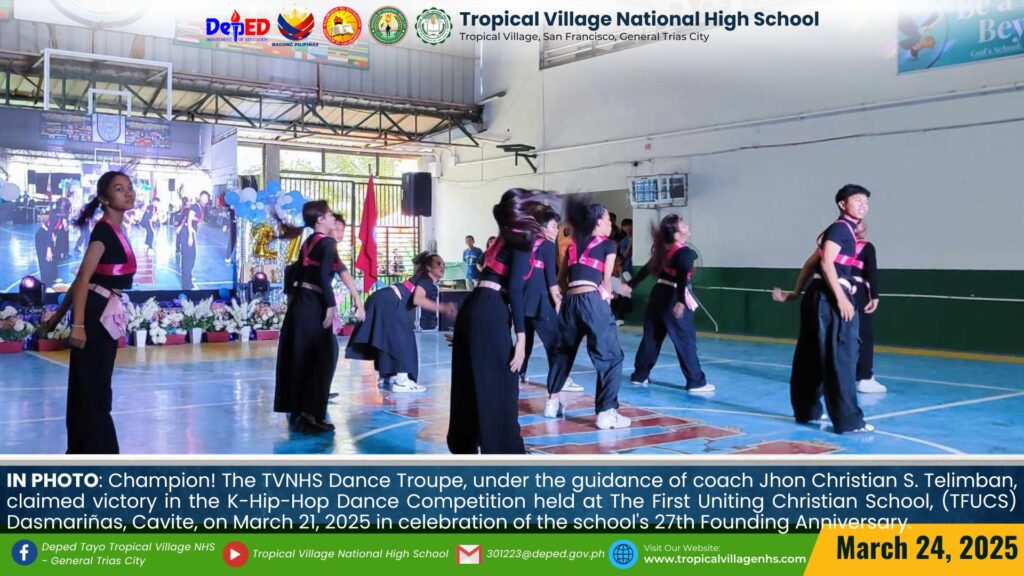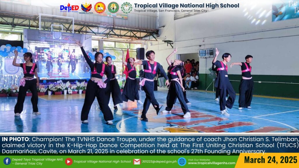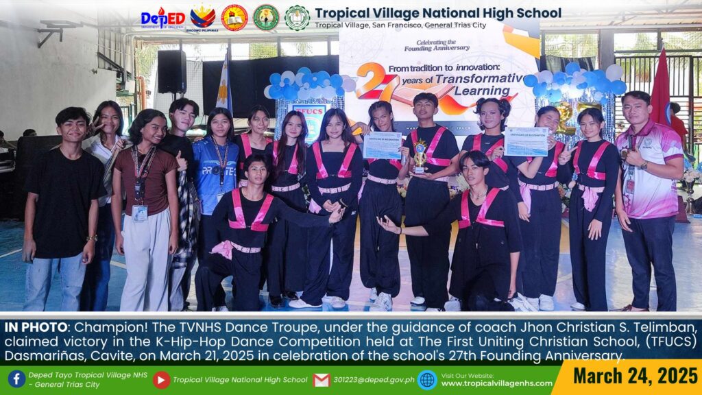 Champion! The TVNHS Dance Troupe, under the guidance of coach Jhon Christian S. Telimban, claimed victory in the K-Hip-Hop Dance Competition held at The First Uniting Christian School (TFUCS) Dasmariñas, Cavite, on March 21, 2025, in celebration of the school’s 27th Founding Anniversary.