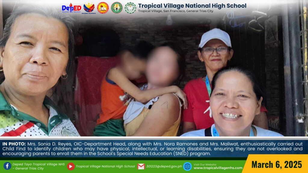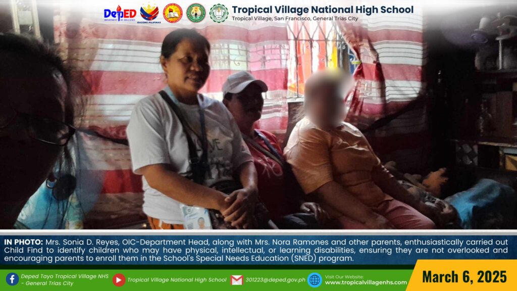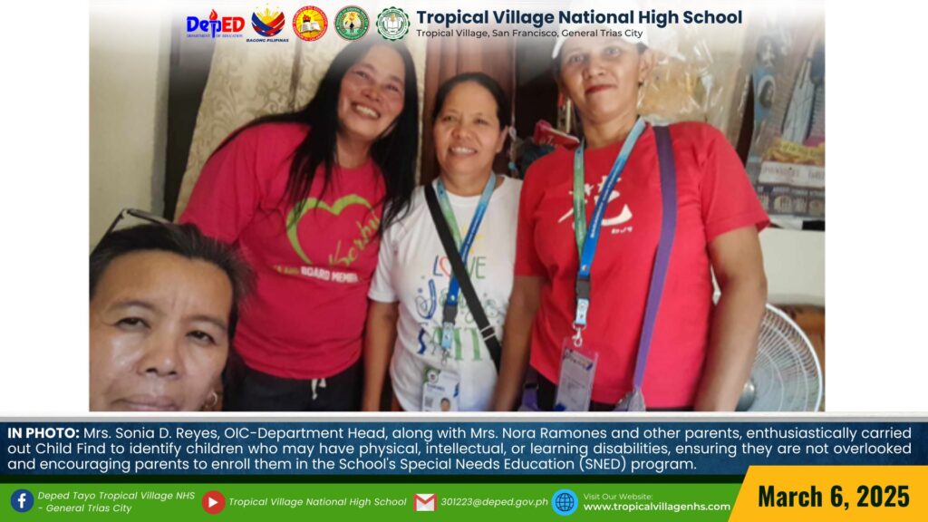 Mrs. Sonia D. Reyes, OIC-Department Head, along with Mrs. Nora Ramones and other parents, enthusiastically carried out Child Find to identify children who may have physical, intellectual, or learning disabilities, ensuring they are not overlooked and encouraging parents to enroll them in the School’s Special Needs Education (SNED) program.