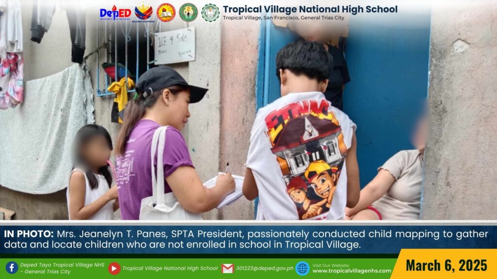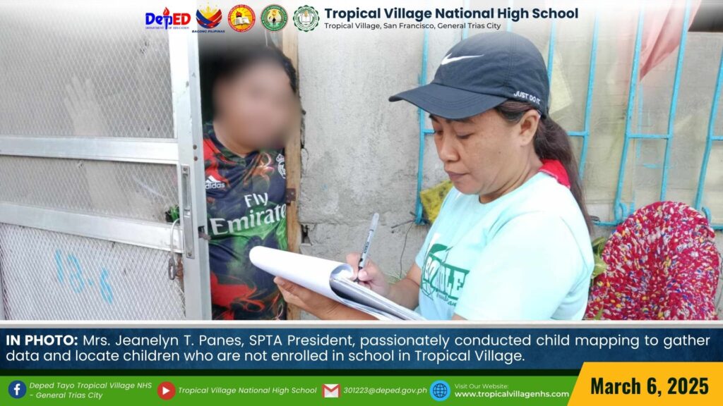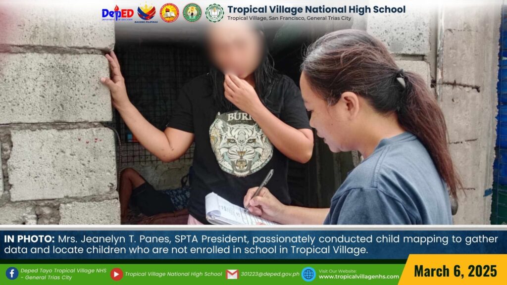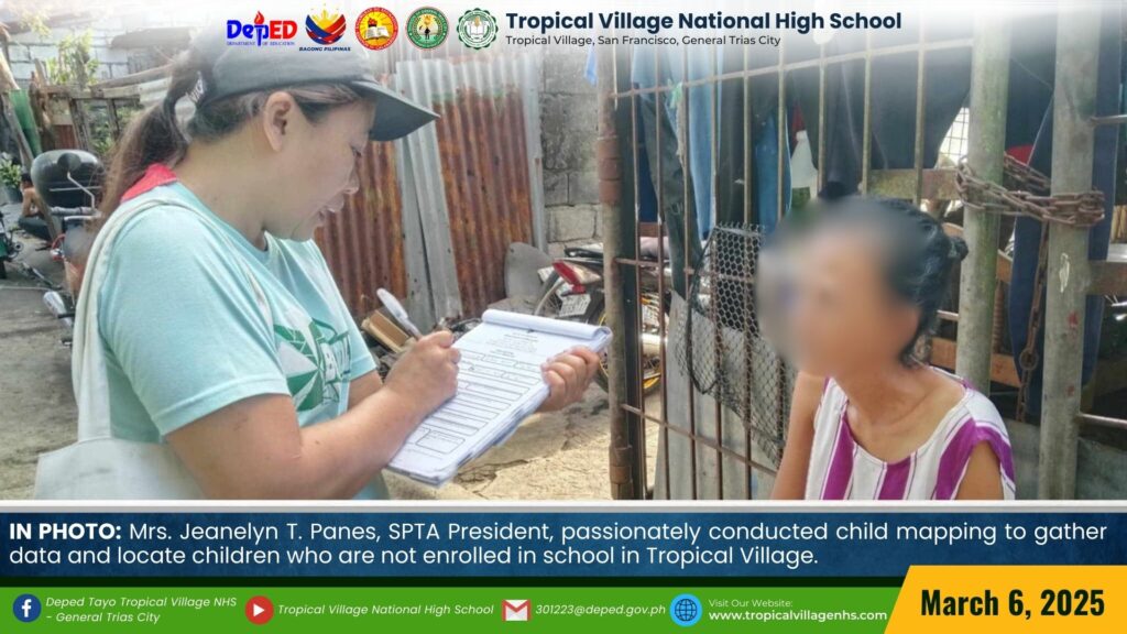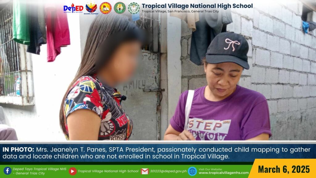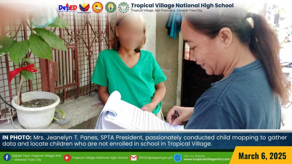 Mrs. Jeanelyn T. Panes, SPTA President, passionately conducted Child Mapping to gather data and locate children who are not enrolled in school in Tropical Village.