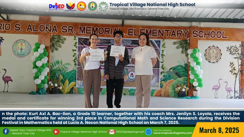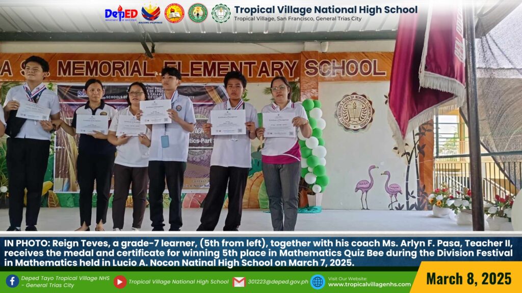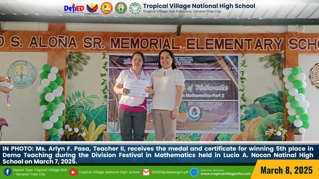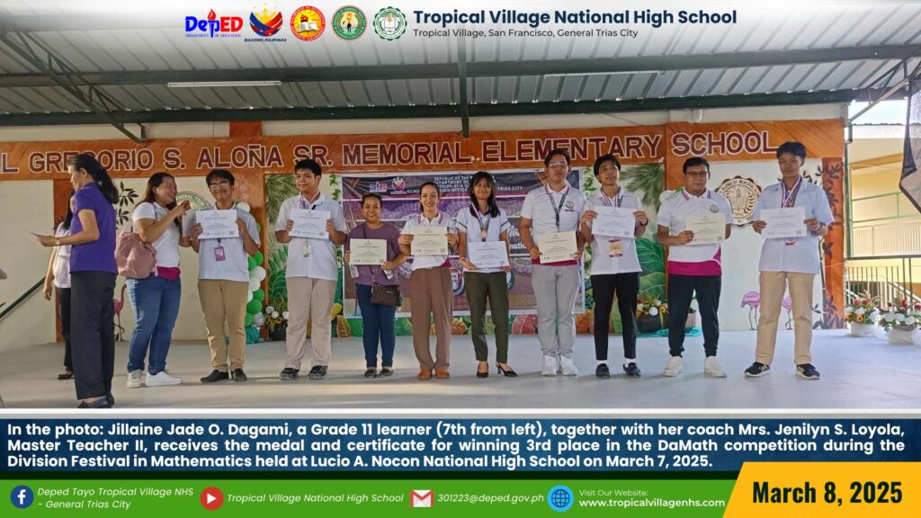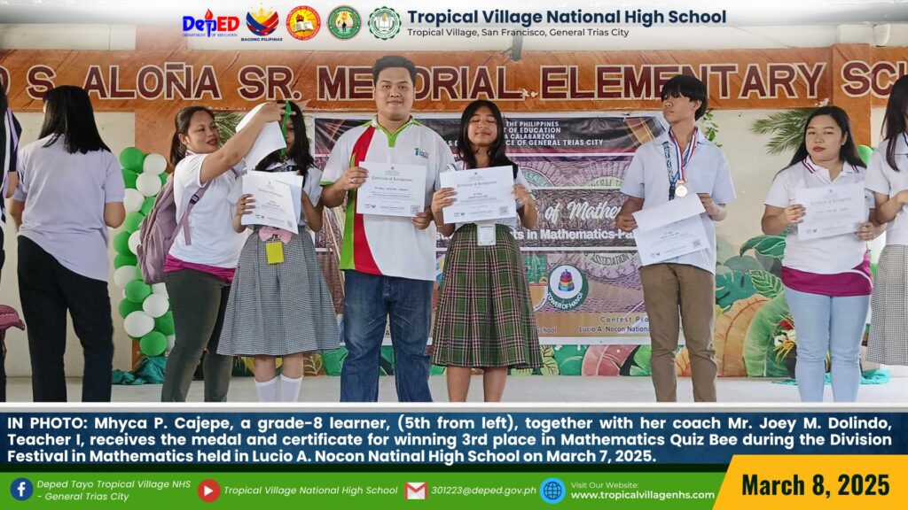 Celebrating academic excellence at the Division Festival in Mathematics held at Lucio A. Nocon National High School on March 7, 2025. Ms. Arlyn F. Pasa, Teacher II, receives a medal and certificate for her 5th place win in Demonstration Teaching. Sharmen B. Brillo, a Grade 7 learner trained by Mr. Jose M. Amparo, Teacher III, is honored with a 2nd place award in the Sudoku competition. Jillaine Jade O. Dagami, a Grade 11 learner trained by Mrs. Jenilyn S. Loyola, Master Teacher II, shines with a 3rd place award in DaMath. Kurt Axl A. Bac-lian, a Grade 10 learner, also trained by Mrs. Jenilyn S. Loyola, Master Teacher II, secures 3rd place in Computational Math and Science Research. Mhyca P. Cajepe, a Grade 8 learner trained by Mr. Joey M. Dolindo, Teacher I, proudly wins 3rd place in the Mathematics Quiz Bee, while Reign L. Teves, a Grade 7 learner trained by Ms. Arlyn F. Pasa, Teacher II, takes home 5th place in the Mathematics Quiz Bee.