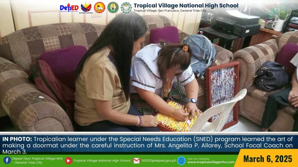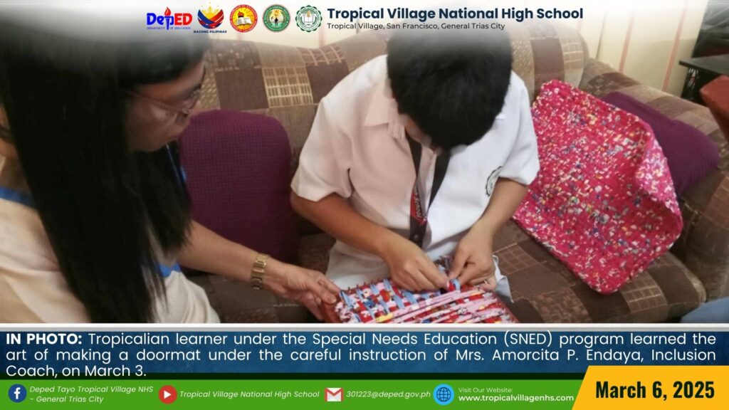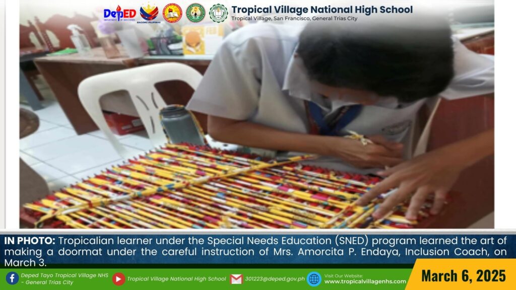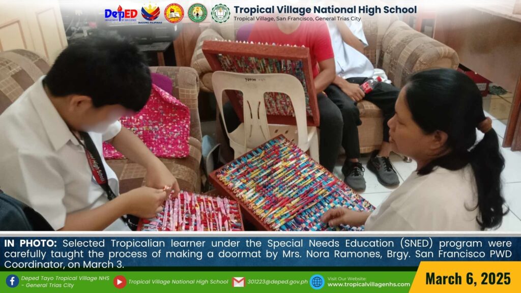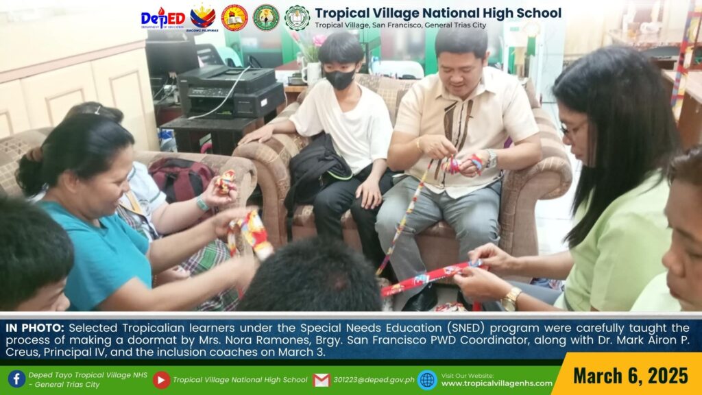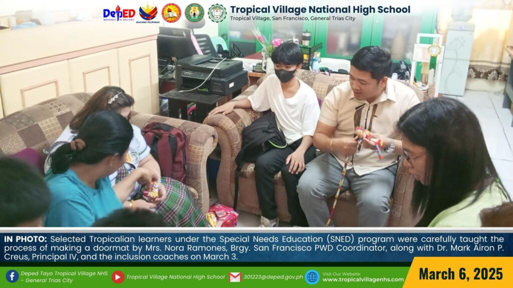 Selected Tropicalian learners under the Special Needs Education (SNED) program were carefully taught the process of making a doormat by Mrs. Nora Ramones, Brgy. San Francisco PWD Coordinator, along with Mrs. Angelita Allarey, School Focal Coach, Mrs. Elsie Palapal, and Mrs. Amorcita P. Endaya, Inclusion Coach, on March 3.